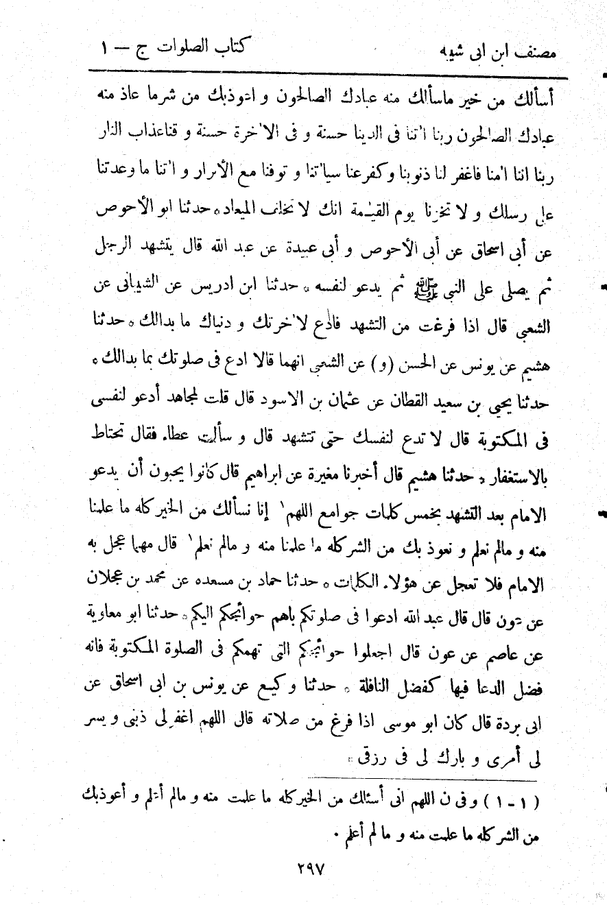 3047- حَدَّثَنَا هُشَيْمٌ ، قَالَ : أَخْبَرَنَا مُغِيرَةُ ، عَنْ إبْرَاهِيمَ ، قَالَ : كَانُوا يُحِبُّونَ أَنْ يَدْعُوَ الإِمَامُ بَعْدَ التَّشَهُّدِ بِخَمْسِ كَلِمَاتٍ جَوَامِعَ : اللَّهُمَّ إنَّا نَسْأَلُك مِنَ الْخَيْرِ كُلِّهِ ، مَا عَلِمْنَا مِنْهُ ، وَمَا لَمْ نَعْلَمْ ، وَنَعُوذُ بِكَ مِنَ الشَّرِّ كُلِّهِ ، مَا عَلِمْنَا مِنْهُ ، وَمَا لَمْ نَعْلَمْ ، قَالَ : فَمَهْمَا عَجِلَ بِهِ الإِمَامُ فَلاَ يَعْجَلْ عَنْ هَؤُلاَءِ الْكَلِمَاتِ.