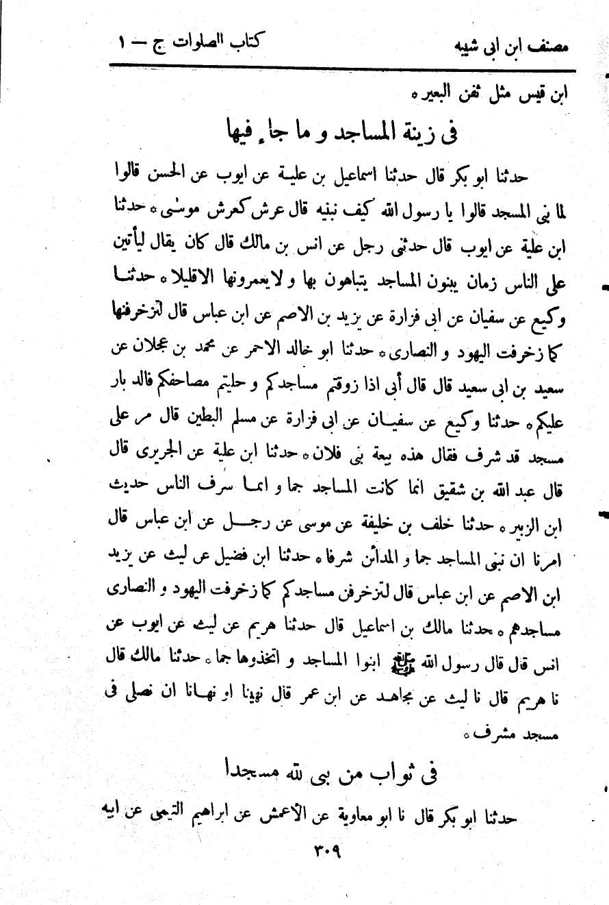 3171- حَدَّثَنَا مَالِكُ بْنُ إسْمَاعِيلَ ، قَالَ : حدَّثَنَا هُرَيْمٌ ، عَنْ لَيْثٍ ، عَنْ أَيُّوبَ ، عَنْ أَنَسٍ ، قَالَ : قَالَ رَسُولُ اللهِ صلى الله عليه وسلم : ابْنُوا الْمَسَاجِدَ وَاِتَّخِذُوهَا جُمًّا.