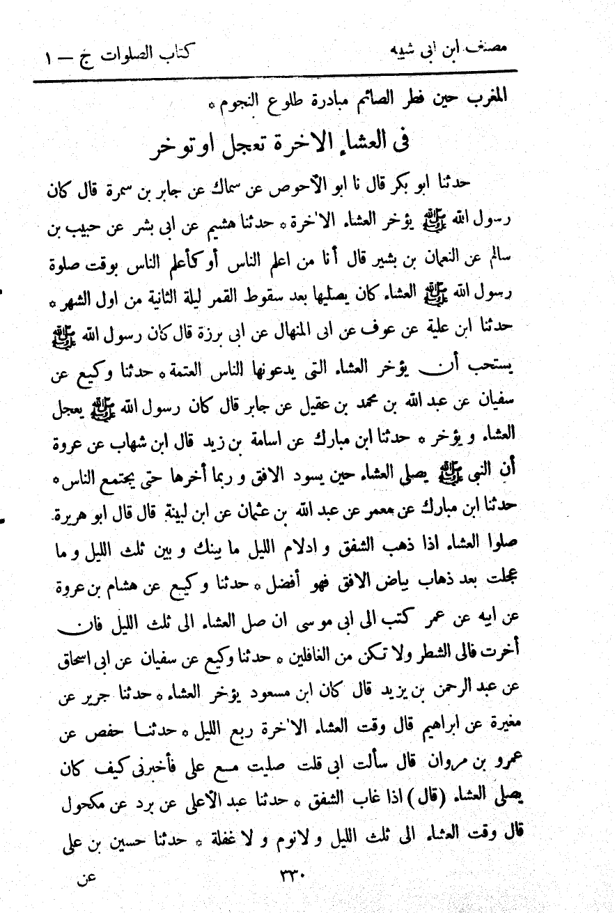 3361- حَدَّثَنَا حَفْصٌ ، عَنْ عَمْرِو بْنِ مَرْوَانَ ، قَالَ : سَأَلْتُ أَبِي ، قُلْتُ : صَلَّيْتَ مَعَ عَلِيٍّ ، فَأَخْبِرْنِي كَيْفَ كَانَ يُصَلِّي الْعِشَاءَ ؟ قَالَ : إذَا غَابَ الشَّفَقُ.