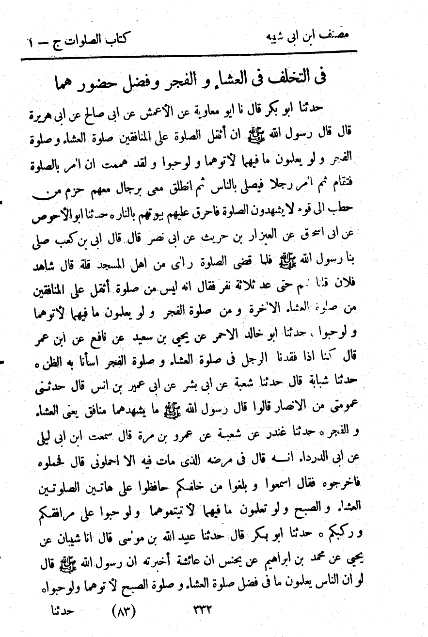 3371- حَدَّثَنَا أَبُو الأَحْوَصِِ ، عَنْ أَبِي إِسْحَاقَ ، عَنِ الْعَيْزَارِ بْنِ حُرَيْثٍ ، عَنْ أَبِي بَصِيرٍ ، قَالَ : قَالَ أُبَيّ بْنُ كَعْبٍ : صَلَّى بِنَا رَسُولُ اللهِ صلى الله عليه وسلم ، فَلَمَّا قَضَى الصَّلاَةَ ، رَأَى مِنْ أَهْلِ الْمَسْجِدِ قِلَّةً ، قَالَ : شَاهِدٌ فُلاَنٌ ؟ قُلْنَا : نَعَمْ ، حَتَّى عَدَّ ثَلاَثَةَ نَفَرٍ ، فَقَالَ : إِنَّهُ لَيْسَ مِنْ صَلاَةٍ أَثْقَلُ عَلَى الْمُنَافِقِينَ مِنْ صَلاَةِ الْعِشَاءِ الآخِرَةِ ، وَمِنْ صَلاَةِ الْفَجْرِ ، وَلَوْ يَعْلَمُونَ مَا فِيهِمَا لأَتَوْهُمَا وَلَوْ حَبْوًا.