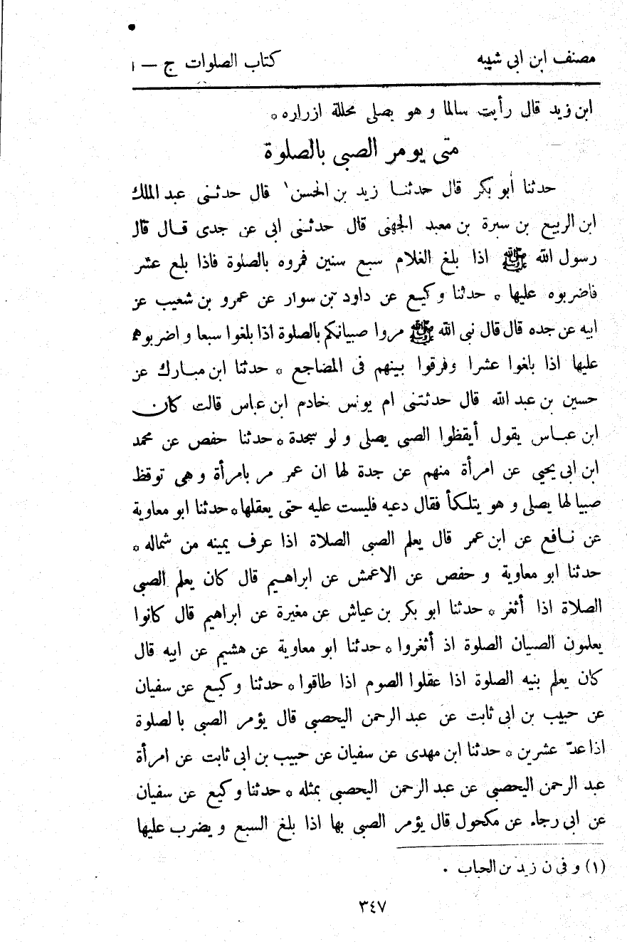 3506- حَدَّثَنَا أَبُو بَكْرِ بْنُ عَيَّاشٍ ، عَنْ مُغِيرَةَ ، عَنْ إبْرَاهِيمَ ، قَالَ : كَانُوا يُعَلِّمُونَ الصِّبْيَانَ الصَّلاَةَ إذَا اثَّغَرُوا.