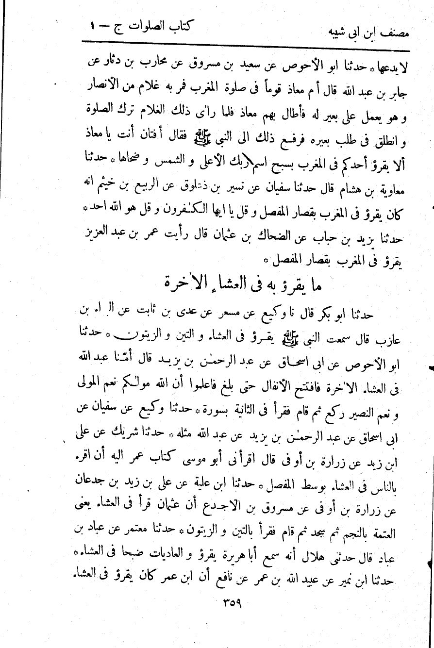 3631- حَدَّثَنَا شَرِيكٌ ، عَنْ عَلِيِّ بْنِ زَيْدٍ ، عَنْ زُرَارَةَ بْنِ أَوْفَى ، قَالَ : أَقْرَأَنِي أَبُو مُوسَى كِتَابَ عُمَرَ إلَيْهِ : أَنَ اقْرَأْ بِالنَّاسِ فِي الْعِشَاءِ بِوَسَطِ الْمُفَصَّلِ.