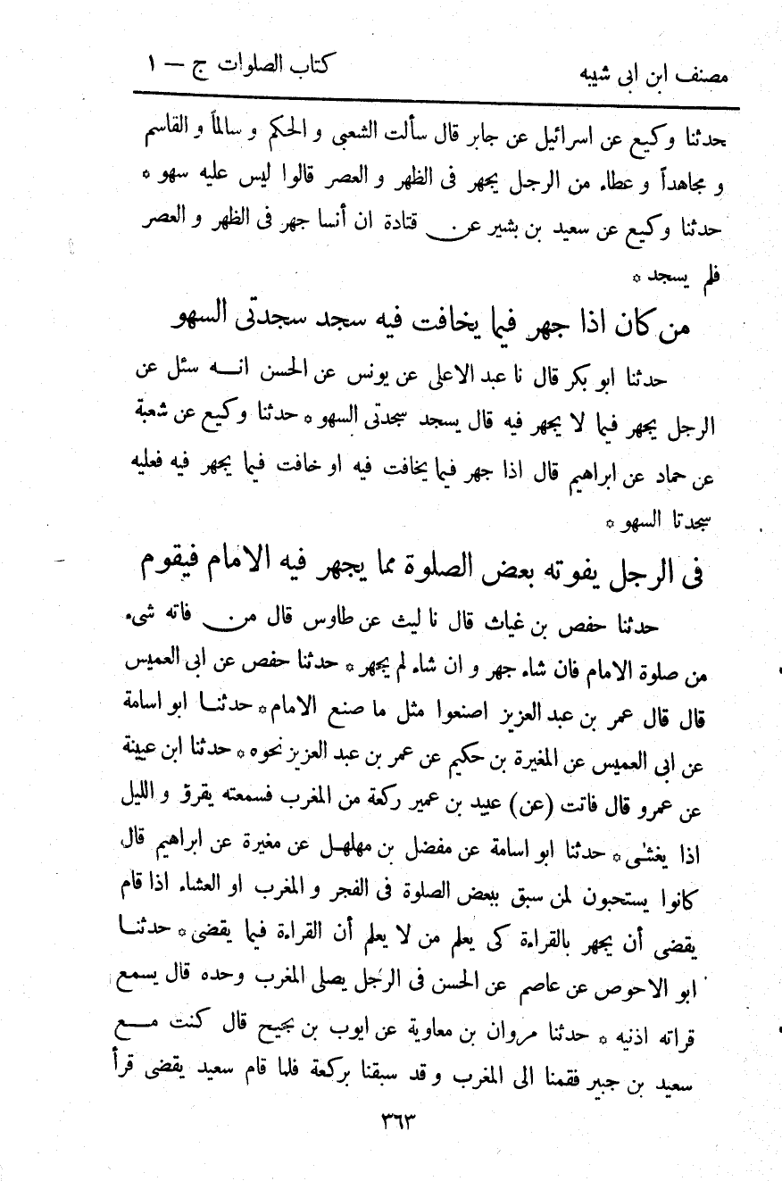 3674- حَدَّثَنَا أَبُو أُسَامَةَ ، عَنْ مُفَضَّلِ بْنِ مُهَلْهِل ، عَنْ مُغِيرَةَ ، عَنْ إبْرَاهِيمَ ، قَالَ : كَانُوا يَسْتَحِبُّونَ لِمَنْ سُبِقَ بِبَعْضِ الصَّلاَةِ فِي الْفَجْرِ أَوَ الْمَغْرِبِ أَوِ الْعِشَاءِ إذَا قَامَ يَقْضِي ، أَنْ يَجْهَرَ بِالْقِرَاءَةِ ، كَيْ يَعْلَمَ مَنْ لاَ يَعْلَمُ أَنَّ الْقِرَاءَةَ فِيمَا يُقْضَى.