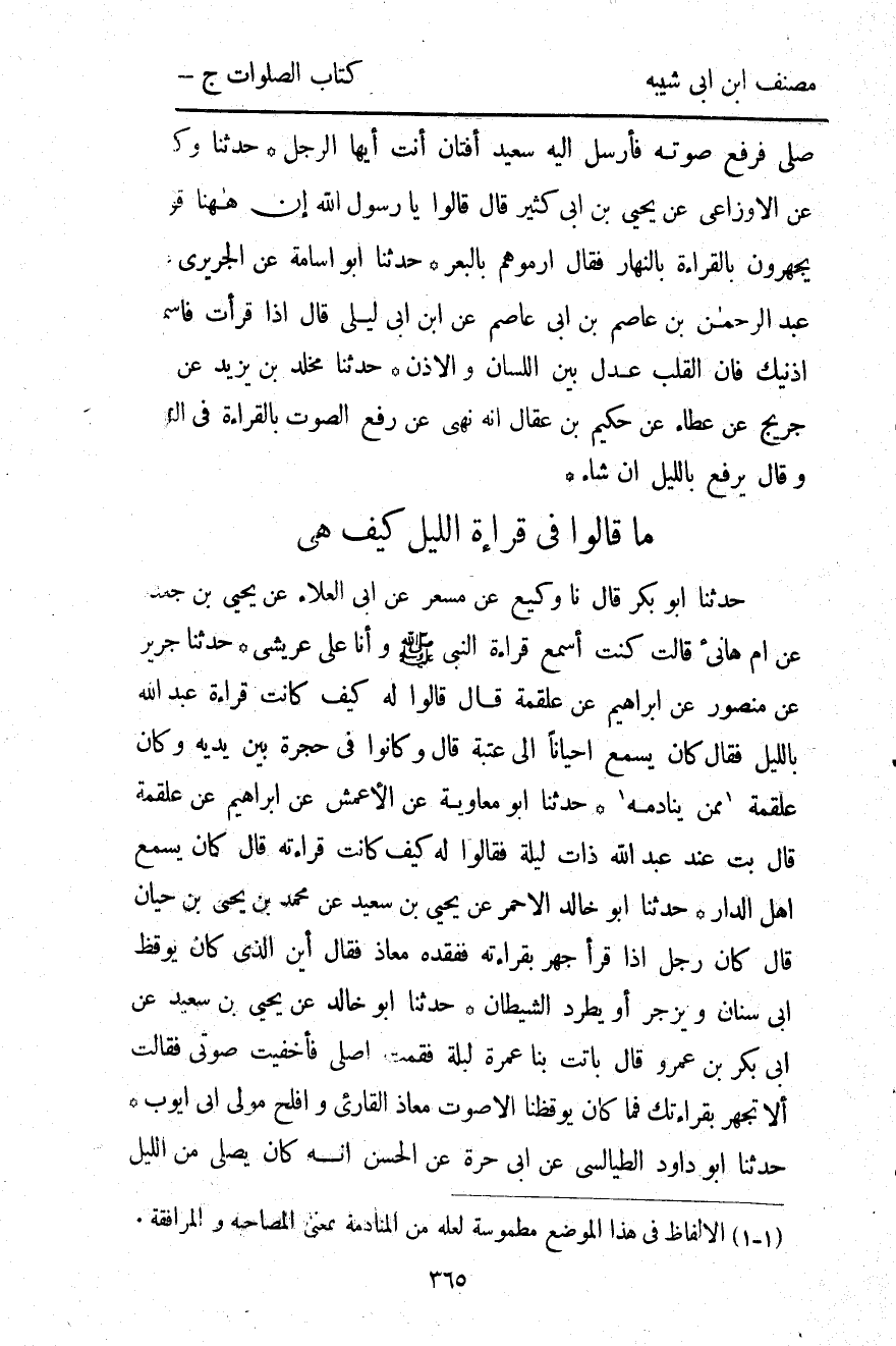 3694- حَدَّثَنَا أَبُو مُعَاوِيَةَ ، عَنِ الأَعْمَشِ ، عَنْ إِبْرَاهِيمَ ، عَن عَلْقَمَةَ ، قَالَ : بِتُّ عِنْدَ عَبْدِ اللهِ ذَاتَ لَيْلَةٍ ، فَقَالُوا لَهُ : كَيْفَ كَانَتْ قِرَاءَتُهُ ؟ قَالَ : كَانَ يُسْمِعُ أَهْلَ الدَّارِ.