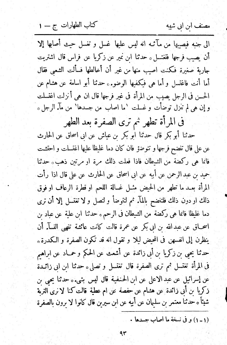 1002- حَدَّثَنَا يَحْيَى بْنُ زَكَرِيَّا بْنِ أَبِي زَائِدَةَ ، عَنْ أَشْعَثَ ، عَنِ الْحَكَمِ وَحَمَّادٍ ، عَنْ إبْرَاهِيمَ ؛ فِي الْمَرْأَةِ تَغْتَسِلُ ، ثُمَّ تَرَى الصُّفْرَةَ ، قَالَ : تَغْتَسِلُ وَتُصَلِّي.
