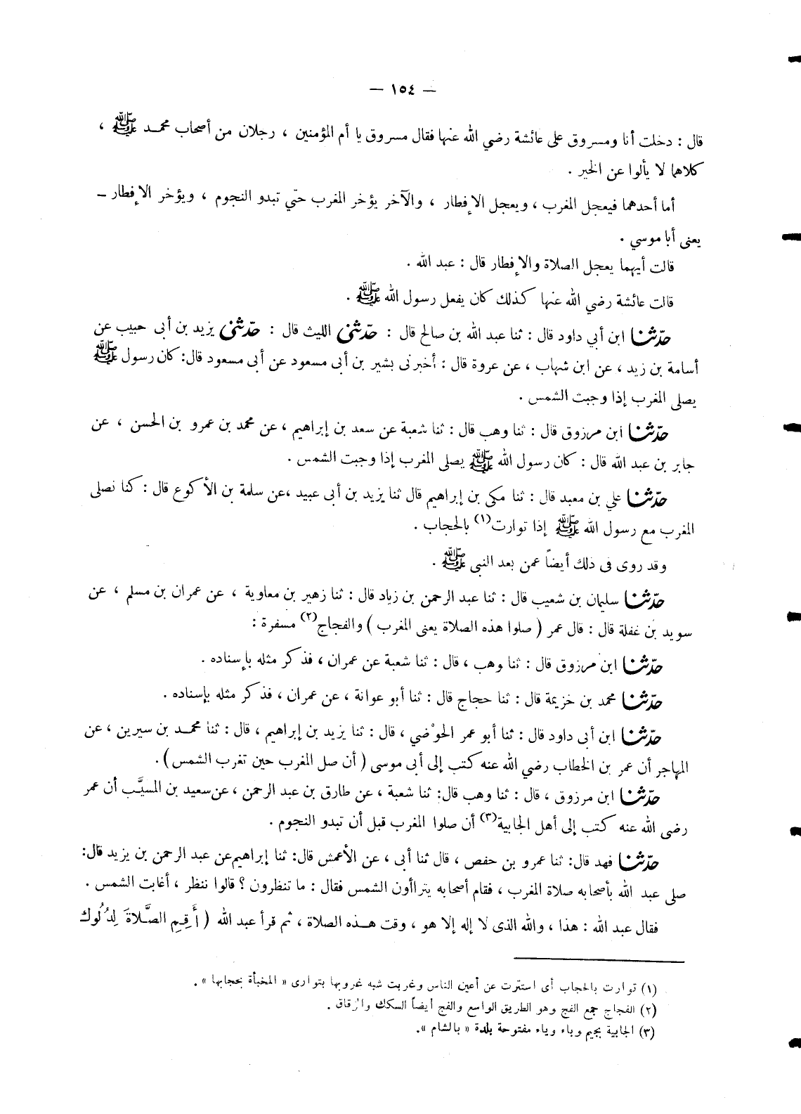 934 - حَدَّثَنَا ابْنُ مَرْزُوقٍ، قَالَ: ثنا وَهْبٌ، قَالَ: ثنا شُعْبَةُ، عَنْ طَارِقِ بْنِ عَبْدِ الرَّحْمَنِ، عَنْ سَعِيدِ بْنِ الْمُسَيِّبِ، أَنَّ عُمَرَ، رَضِيَ اللهُ عَنْهُ كَتَبَ إِلَى أَهْلِ الْجَابِيَةِ: «أَنْ §صَلُّوا الْمَغْرِبَ قَبْلَ أَنْ تَبْدُوَ النُّجُومُ»