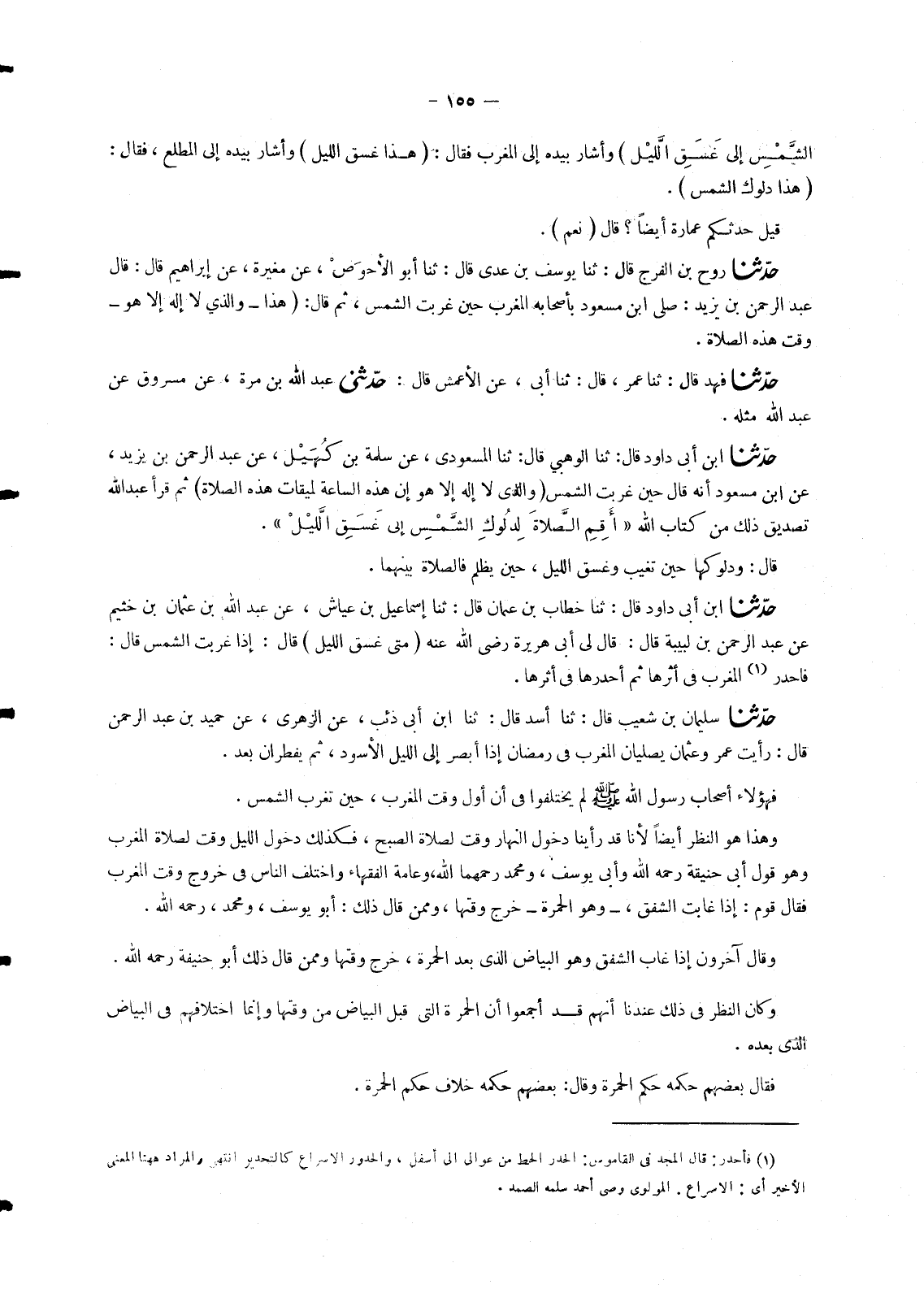 940 - حَدَّثَنَا سُلَيْمَانُ بْنُ شُعَيْبٍ، قَالَ: ثنا أَسَدٌ، قَالَ: ثنا ابْنُ أَبِي ذِئْبٍ، عَنِ الزُّهْرِيِّ، عَنْ حُمَيْدِ بْنِ عَبْدِ الرَّحْمَنِ، قَالَ: رَأَيْتُ عُمَرَ وَعُثْمَانَ §يُصَلِّيَانِ الْمَغْرِبَ فِي رَمَضَانَ إِذَا أَبْصَرَ إِلَى اللَّيْلِ الْأَسْوَدِ , ثُمَّ يُفْطِرَانِ بَعْدُ " فَهَؤُلَاءِ أَصْحَابُ رَسُولِ اللهِ صَلَّى اللَّهُ عَلَيْهِ وَسَلَّمَ لَمْ يَخْتَلِفُوا فِي أَنَّ أَوَّلَ وَقْتِ الْمَغْرِبِ , حِينَ تَغْرُبُ الشَّمْسُ. وَهَذَا هُوَ النَّظَرُ أَيْضًا لِأَنَّا قَدْ رَأَيْنَا دُخُولَ النَّهَارِ وَقْتًا لِصَلَاةِ الصُّبْحِ , فَكَذَلِكَ دُخُولُ اللَّيْلِ وَقْتٌ لِصَلَاةِ الْمَغْرِبِ وَهُوَ قَوْلُ أَبِي حَنِيفَةَ رَحِمَهُ اللهُ وَأَبِي يُوسُفَ , وَمُحَمَّدٍ رَحِمَهُمَا اللهُ , وَعَامَّةِ الْفُقَهَاءِ وَاخْتَلَفَ النَّاسُ فِي خُرُوجِ وَقْتِ الْمَغْرِبِ فَقَالَ قَوْمٌ: " إِذَا غَابَتِ الشَّفَقُ، وَهُوَ الْحُمْرَةُ، خَرَجَ وَقْتُهَا , وَمِمَّنْ قَالَ: ذَلِكَ: أَبُو يُوسُفَ , وَمُحَمَّدٌ رَحِمَهُ اللهُ. وَقَالَ آخَرُونَ: إِذَا غَابَ الشَّفَقُ وَهُوَ الْبَيَاضُ الَّذِي بَعْدَ الْحُمْرَةِ , خَرَجَ وَقْتُهَا وَمِمَّنْ قَالَ ذَلِكَ أَبُو حَنِيفَةَ رَحِمَهُ اللهُ. وَكَانَ النَّظَرُ فِي ذَلِكَ عِنْدَنَا أَنَّهُمْ قَدْ أَجْمَعُوا أَنَّ الْحُمْرَةَ الَّتِي قَبْلَ الْبَيَاضِ مِنْ وَقْتِهَا وَإِنَّمَا اخْتِلَافُهُمْ فِي الْبَيَاضِ الَّذِي بَعْدَهُ. فَقَالَ بَعْضُهُمْ: حُكْمُهُ حُكْمُ الْحُمْرَةِ وَقَالَ بَعْضُهُمْ: حُكْمُهُ خِلَافُ حُكْمِ الْحُمْرَةِ. -[156]- فَنَظَرْنَا فِي ذَلِكَ فَرَأَيْنَا الْفَجْرَ يَكُونُ قَبْلَهُ حُمْرَةٌ ثُمَّ يَتْلُوهَا بَيَاضُ الْفَجْرِ فَكَانَتِ الْحُمْرَةُ وَالْبَيَاضُ فِي ذَلِكَ وَقْتًا لِصَلَاةٍ وَاحِدَةٍ , وَهُوَ الْفَجْرُ فَإِذَا خَرَجَا , خَرَجَ وَقْتُهَا. فَالنَّظَرُ عَلَى ذَلِكَ أَنْ يَكُونَ الْبَيَاضُ وَالْحُمْرَةُ فِي الْمَغْرِبِ أَيْضًا وَقْتًا لِصَلَاةٍ وَاحِدَةٍ وَحُكْمُهُمَا حُكْمٌ وَاحِدٌ إِذَا خَرَجَا , خَرَجَ وَقْتَا الصَّلَاةِ اللَّذَانِ هُمَا وَقْتٌ لَهَا. وَأَمَّا الْعِشَاءُ الْآخِرَةُ فَإِنَّ تِلْكَ الْآثَارَ كُلُّهَا فِيهَا أَنَّ رَسُولَ اللهِ صَلَّى اللَّهُ عَلَيْهِ وَسَلَّمَ صَلَّاهَا فِي أَوَّلِ يَوْمٍ , بَعْدَمَا غَابَ الشَّفَقُ , إِلَّا جَابِرَ بْنَ عَبْدِ اللهِ , فَإِنَّهُ ذَكَرَ أَنَّهُ صَلَّاهَا قَبْلَ أَنْ يَغِيبَ الشَّفَقُ. فَيُحْتَمَلُ ذَلِكَ عِنْدَنَا وَاللهُ أَعْلَمُ أَنْ يَكُونَ جَابِرٌ عَنَى الشَّفَقَ الَّذِي هُوَ الْبَيَاضُ , وَعَنَى الْآخَرُونَ الشَّفَقَ الَّذِي هُوَ الْحُمْرَةُ , فَيَكُونَ قَدْ صَلَّاهَا بَعْدَ غَيْبُوبَةِ الْحُمْرَةِ , وَقَبْلَ غَيْبُوبَةِ الْبَيَاضِ , حَتَّى تَصِحَّ هَذِهِ الْآثَارُ وَلَا تَتَضَادَّ. وَفِي ثُبُوتِ مَا ذَكَرْنَا مَا يَدُلُّ عَلَى مَا قَالَ بَعْضُهُمْ: إِنَّ بَعْدَ غَيْبُوبَةِ الْحُمْرَةِ وَقْتُ الْمَغْرِبِ إِلَى أَنْ يَغِيبَ الْبَيَاضُ. وَأَمَّا آخِرُ وَقْتِ الْعِشَاءِ الْآخِرَةِ فَإِنَّ ابْنَ عَبَّاسٍ رَضِيَ اللهُ عَنْهُمَا وَأَبَا سَعِيدٍ الْخُدْرِيَّ وَأَبَا مُوسَى , ذَكَرُوا أَنَّ رَسُولَ اللهِ صَلَّى اللَّهُ عَلَيْهِ وَسَلَّمَ أَخَّرَهَا إِلَى ثُلُثِ اللَّيْلِ , ثُمَّ صَلَّاهَا. وَقَالَ جَابِرُ بْنُ عَبْدِ اللهِ: صَلَّاهَا فِي وَقْتٍ قَالَ بَعْضُهُمْ: هُوَ ثُلُثُ اللَّيْلِ , وَقَالَ بَعْضُهُمْ: هُوَ نِصْفُ اللَّيْلِ فَاحْتُمِلَ أَنْ يَكُونَ صَلَّاهَا قَبْلَ مُضِيِّ الثُّلُثِ , فَيَكُونُ مُضِيُّ الثُّلُثِ , هُوَ آخِرُ وَقْتِهَا. وَاحْتُمِلَ أَنْ يَكُونَ صَلَّاهَا بَعْدَ الثُّلُثِ , فَيَكُونُ قَدْ بَقِيَتْ بَقِيَّةٌ مِنْ وَقْتِهَا بَعْدَ خُرُوجِ الثُّلُثِ. فَلَم