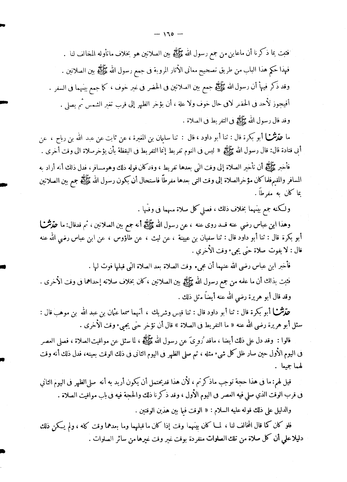 989 - حَدَّثَنَا أَبُو بَكْرَةَ، قَالَ: ثنا أَبُو دَاوُدَ، قَالَ: ثنا قَيْسٌ، وَشَرِيكٌ، أَنَّهُمَا سَمِعَا عُثْمَانَ بْنَ عَبْدِ اللهِ بْنِ مَوْهَبٍ، قَالَ: سُئِلَ أَبُو هُرَيْرَةَ رَضِيَ اللهُ عَنْهُ: §مَا التَّفْرِيطُ فِي الصَّلَاةِ؟ قَالَ: «أَنْ تُؤَخَّرَ حَتَّى يَجِيءَ وَقْتُ الْأُخْرَى» قَالُوا: وَقَدْ دَلَّ عَلَى ذَلِكَ أَيْضًا , مَا قَدْ رُوِيَ عَنْ رَسُولِ اللهِ صَلَّى اللَّهُ عَلَيْهِ وَسَلَّمَ , لَمَّا سُئِلَ عَنْ مَوَاقِيتِ الصَّلَاةِ , فَصَلَّى الْعَصْرَ فِي الْيَوْمِ الْأَوَّلِ حِينَ صَارَ ظِلُّ كُلِّ شَيْءٍ مِثْلَهُ , ثُمَّ صَلَّى الظُّهْرَ فِي الْيَوْمِ الثَّانِي فِي ذَلِكَ الْوَقْتِ بِعَيْنِهِ , فَدَلَّ ذَلِكَ أَنَّهُ وَقْتٌ لَهُمَا جَمِيعًا. قِيلَ لَهُمْ: مَا فِي هَذَا حُجَّةٌ تُوجِبُ مَا ذَكَرْتُمْ , لِأَنَّ هَذَا قَدْ يُحْتَمَلُ أَنْ يَكُونَ أُرِيدَ بِهِ أَنَّهُ صَلَّى الظُّهْرَ فِي الْيَوْمِ الثَّانِي فِي قُرْبِ الْوَقْتِ الَّذِي صَلَّى فِيهِ الْعَصْرَ فِي الْيَوْمِ الْأَوَّلِ , وَقَدْ ذَكَرْنَا ذَلِكَ وَالْحُجَّةَ فِيهِ فِي بَابِ مَوَاقِيتِ الصَّلَاةِ. وَالدَّلِيلُ عَلَى ذَلِكَ قَوْلُهُ عَلَيْهِ السَّلَامُ «الْوَقْتُ فِيمَا بَيْنَ هَذَيْنِ الْوَقْتَيْنِ» فَلَوْ كَانَ كَمَا قَالَ: الْمُخَالِفُ لَنَا , لَمَا كَانَ بَيْنَهُمَا وَقْتٌ إِذَا كَانَ مَا قَبْلَهُمَا وَمَا بَعْدَهُمَا وَقْتٌ كُلُّهُ , وَلَمْ يَكُنْ ذَلِكَ دَلِيلًا عَلَى أَنَّ كُلَّ صَلَاةٍ مِنْ تِلْكَ الصَّلَوَاتِ مُنْفَرِدَةٌ بِوَقْتٍ غَيْرِ وَقْتِ غَيْرِهَا مِنْ سَائِرِ الصَّلَوَاتِ. -[166]- وَحُجَّةٌ أُخْرَى أَنَّ عَبْدَ اللهِ بْنَ عَبَّاسٍ , وَأَبَا هُرَيْرَةَ رَضِيَ اللهُ عَنْهُمَا قَدْ رَوَيَا ذَلِكَ , عَنِ النَّبِيِّ صَلَّى اللَّهُ عَلَيْهِ وَسَلَّمَ فِي مَوَاقِيتِ الصَّلَاةِ ثُمَّ قَالَاهُمَا فِي التَّفْرِيطِ فِي الصَّلَاةِ أَنَّهُ تَرْكُهَا حَتَّى يَدْخُلَ وَقْتُ الَّتِي بَعْدَهَا. فَثَبَتَ بِذَلِكَ أَنَّ وَقْتَ كُلِّ صَلَاةٍ مِنَ الصَّلَوَاتِ خِلَافُ وَقْتِ الصَّلَاةِ الَّتِي بَعْدَهَا فَهَذَا وَجْهُ هَذَا الْبَابِ مِنْ طَرِيقِ تَصْحِيحِ مَعَانِي الْآثَارِ. وَأَمَّا وَجْهُ ذَلِكَ مِنْ طَرِيقِ النَّظَرِ فَإِنَّا قَدْ رَأَيْنَاهُمْ أَجْمَعُوا أَنَّ صَلَاةَ الصُّبْحِ لَا يَنْبَغِي أَنْ تُقَدَّمَ عَلَى وَقْتِهَا وَلَا تُؤَخَّرَ عَنْهُ فَإِنَّ وَقْتَهَا وَقْتٌ لَهَا خَاصَّةً دُونَ غَيْرِهَا مِنَ الصَّلَاةِ. فَالنَّظَرُ عَلَى ذَلِكَ أَنْ يَكُونَ كَذَلِكَ سَائِرُ الصَّلَوَاتِ , كُلُّ وَاحِدَةٍ مِنْهُنَّ مُنْفَرِدَةٌ لِوَقْتِهَا دُونَ غَيْرِهَا فَلَا يَنْبَغِي أَنْ يُؤَخَّرَ عَنْ وَقْتِهَا وَلَا يُقَدَّمَ قَبْلَهُ. فَإِنِ اعْتَلَّ مُعْتَلٌّ بِالصَّلَاةِ بِعَرَفَةَ وَبِجَمْعٍ. قِيلَ لَهُ قَدْ رَأَيْنَاهُمْ أَجْمَعُوا أَنَّ الْإِمَامَ بِعَرَفَةَ , لَوْ صَلَّى الظُّهْرَ فِي وَقْتِهَا , فِي سَائِرِ الْأَيَّامِ , وَصَلَّى الْعَصْرَ فِي وَقْتِهَا فِي سَائِرِ الْأَيَّامِ , وَفَعَلَ مِثْلَ ذَلِكَ فِي الْمَغْرِبِ وَالْعِشَاءِ بِمُزْدَلِفَةَ , فَصَلَّى كُلَّ وَاحِدَةٍ مِنْهُمَا فِي وَقْتِهَا , كَمَا صَلَّى فِي سَائِرِ الْأَيَّامِ , كَانَ مُسِيئًا. وَلَوْ فَعَلَ ذَلِكَ , وَهُوَ مُقِيمٌ أَوْ فَعَلَهُ , وَهُوَ مُسَافِرٌ , فِي غَيْرِ عَرَفَةَ , وَجَمْعٍ , لَمْ يَكُنْ مُسِيئًا. فَثَبَتَ بِذَلِكَ أَنَّ عَرَفَةَ وَجَمْعًا , مَخْصُوصَتَانِ بِهَذَا الْحُكْمِ , وَأَنَّ حُكْمَ مَا سِوَاهُمَا فِي ذَلِكَ , بِخِلَافِ حُكْمِهِمَا. فَثَبَتَ بِمَا ذَكَرْنَا أَنَّ مَا رَوَيْنَا عَنْ رَسُولِ اللهِ صَلَّى اللَّهُ عَلَيْهِ وَسَلَّمَ مِنَ الْجَمْعِ بَيْنَ الصَّلَاتَيْنِ أَنَّهُ تَأْخِيرُ الْأُولَى , وَتَعْجِيلُ الْآخِرَةِ. وَكَذَلِك