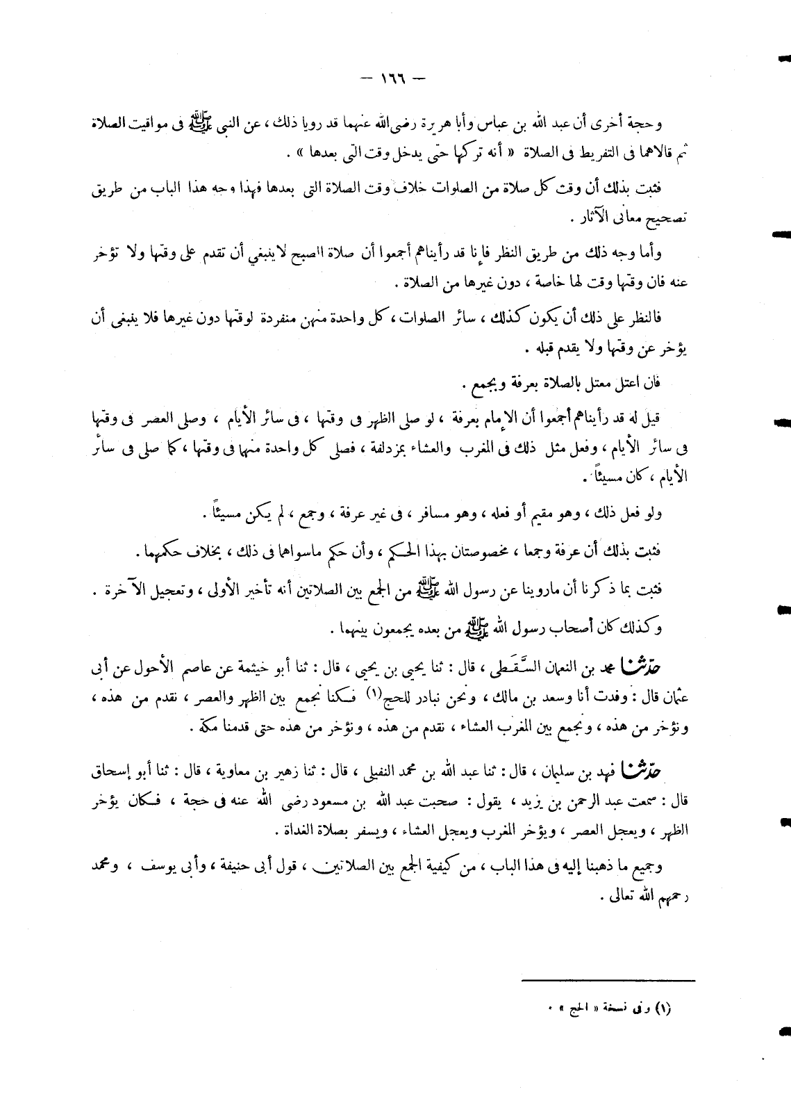 991 - حَدَّثَنَا فَهْدُ بْنُ سُلَيْمَانَ، قَالَ: ثنا عَبْدُ اللهِ بْنُ مُحَمَّدٍ النُّفَيْلِيُّ، قَالَ: ثنا زُهَيْرُ بْنُ مُعَاوِيَةَ، قَالَ: ثنا أَبُو إِسْحَاقَ، قَالَ: سَمِعْتُ عَبْدَ الرَّحْمَنِ بْنَ يَزِيدَ، يَقُولُ: «صَحِبْتُ عَبْدَ اللهِ بْنَ مَسْعُودٍ رَضِيَ اللهُ عَنْهُ فِي حَجَّةٍ , §فَكَانَ يُؤَخِّرُ الظُّهْرَ , وَيُعَجِّلُ الْعَصْرَ , وَيُؤَخِّرُ الْمَغْرِبَ وَيُعَجِّلُ الْعِشَاءَ , وَيُسْفِرُ بِصَلَاةِ الْغَدَاةِ» وَجَمِيعُ مَا ذَهَبْنَا إِلَيْهِ فِي هَذَا الْبَابِ , مِنْ كَيْفِيَّةِ الْجَمْعِ بَيْنَ الصَّلَاتَيْنِ , قَوْلُ أَبِي حَنِيفَةَ , وَأَبِي يُوسُفَ , وَمُحَمَّدٍ رَحِمَهُمُ اللهُ تَعَالَى