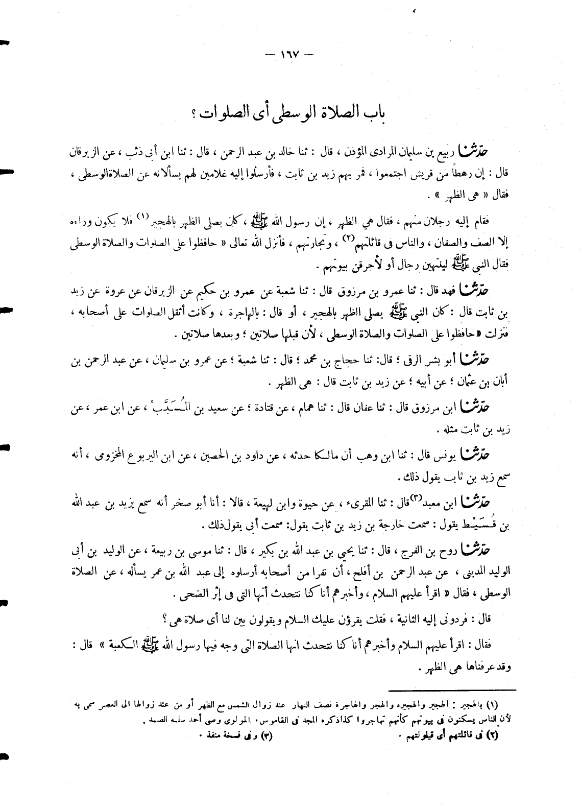 992 - حَدَّثَنَا رَبِيعُ بْنُ سُلَيْمَانَ الْمُرَادِيُّ الْمُؤَذِّنُ , قَالَ: ثنا خَالِدُ بْنُ عَبْدِ الرَّحْمَنِ , قَالَ: ثنا ابْنُ أَبِي ذِئْبٍ , عَنِ الزِّبْرِقَانِ قَالَ: إِنَّ رَهْطًا مِنْ قُرَيْشٍ اجْتَمَعُوا , فَمَرَّ بِهِمْ زَيْدُ بْنُ ثَابِتٍ , فَأَرْسَلُوا إِلَيْهِ غُلَامَيْنِ لَهُمْ يَسْأَلَانِهِ عَنِ الصَّلَاةِ الْوُسْطَى , فَقَالَ: هِيَ الظُّهْرُ فَقَامَ إِلَيْهِ رَجُلَانِ مِنْهُمْ , فَقَالَ: هِيَ الظُّهْرُ , إِنَّ رَسُولَ اللهِ صَلَّى اللَّهُ عَلَيْهِ وَسَلَّمَ , §كَانَ يُصَلِّي الظُّهْرَ بِالْهَجِيرِ فَلَا يَكُونُ وَرَاءَهُ إِلَّا الصَّفُّ وَالصَّفَّانِ , وَالنَّاسُ فِي قَائِلَتِهِمْ , وَتِجَارَتِهِمْ , فَأَنْزَلَ اللهُ تَعَالَى {حَافِظُوا عَلَى الصَّلَوَاتِ وَالصَّلَاةِ الْوُسْطَى} [البقرة: 238] فَقَالَ النَّبِيُّ صَلَّى اللَّهُ عَلَيْهِ وَسَلَّمَ: «لَيَنْتَهِيَنَّ رِجَالٌ أَوْ لَأُحَرِّقَنَّ بُيُوتَهُمْ»