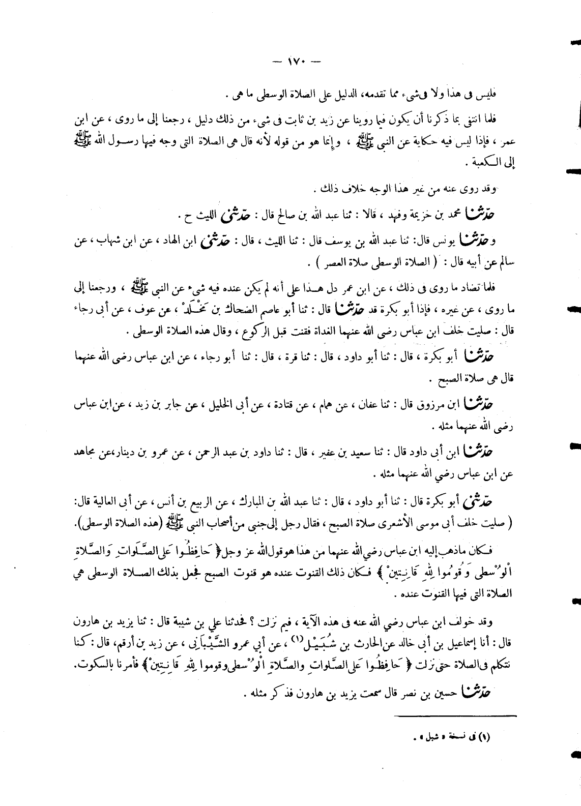 1015 - حَدَّثَنِي أَبُو بَكْرَةَ، قَالَ: ثنا أَبُو دَاوُدَ، قَالَ: ثنا عَبْدُ اللهِ بْنُ الْمُبَارَكِ، عَنِ الرَّبِيعِ بْنِ أَنَسٍ، عَنْ أَبِي الْعَالِيَةِ، قَالَ: §صَلَّيْتُ خَلْفَ أَبِي مُوسَى الْأَشْعَرِيِّ صَلَاةَ الصُّبْحِ , فَقَالَ رَجُلٌ إِلَى جَنْبِي مِنْ أَصْحَابِ النَّبِيِّ صَلَّى اللَّهُ عَلَيْهِ وَسَلَّمَ: «هَذِهِ الصَّلَاةُ الْوُسْطَى» فَكَانَ مَا ذَهَبَ إِلَيْهِ ابْنُ عَبَّاسٍ رَضِيَ اللهُ عَنْهُمَا مِنْ هَذَا هُوَ قَوْلُ اللهِ عَزَّ وَجَلَّ: {حَافِظُوا عَلَى الصَّلَوَاتِ وَالصَّلَاةِ الْوُسْطَى وَقُومُوا لِلَّهِ قَانِتِينَ} [البقرة: 238] فَكَانَ ذَلِكَ الْقُنُوتُ عِنْدَهُ هُوَ قُنُوتُ الصُّبْحِ فَجَعَلَ بِذَلِكَ الصَّلَاةَ الْوُسْطَى هِيَ الصَّلَاةُ الَّتِي فِيهَا الْقُنُوتُ عِنْدَهُ. وَقَدْ خُولِفَ ابْنُ عَبَّاسٍ رَضِيَ اللهُ عَنْهُ فِي هَذِهِ الْآيَةِ , فِيمَ نَزَلَتْ؟