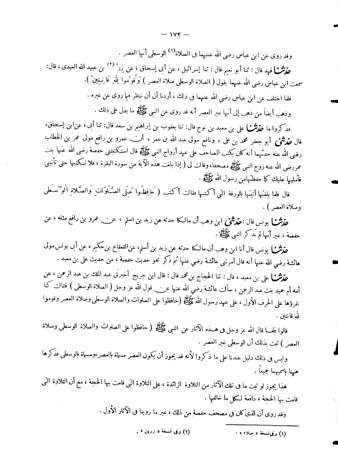 1024 - حَدَّثَنَا عَلِيُّ بْنُ مَعْبَدِ بْنِ نُوحٍ قَالَ: ثنا يَعْقُوبُ بْنُ إِبْرَاهِيمَ بْنِ سَعْدٍ قَالَ: ثنا أَبِي , عَنِ ابْنِ إِسْحَاقَ , قَالَ: حَدَّثَنِي أَبُو جَعْفَرٍ مُحَمَّدُ بْنُ عَلِيٍّ , وَنَافِعٌ مَوْلَى عَبْدِ اللهِ بْنِ عُمَرَ: أَنَّ عَمْرَو بْنَ رَافِعٍ مَوْلَى عُمَرَ بْنِ الْخَطَّابِ رَضِيَ اللهُ عَنْهُ حَدَّثَهُمَا أَنَّهُ كَانَ يَكْتُبُ الْمَصَاحِفَ عَلَى عَهْدِ أَزْوَاجِ النَّبِيِّ صَلَّى اللَّهُ عَلَيْهِ وَسَلَّمَ قَالَ: " اسْتَكْتَبَتْنِي حَفْصَةُ رَضِيَ اللهُ عَنْهَا بِنْتُ عُمَرَ رَضِيَ اللهُ عَنْهَ، زَوْجُ النَّبِيِّ صَلَّى اللَّهُ عَلَيْهِ وَسَلَّمَ مُصْحَفًا، وَقَالَتْ لِي: إِذَا بَلَغْتَ هَذِهِ الْآيَةَ مِنْ سُورَةِ الْبَقَرَةِ , فَلَا تَكْتُبْهَا حَتَّى تَأْتِيَنِي فَأُمْلِيَهَا عَلَيْكَ كَمَا حَفِظْتُهَا مِنْ رَسُولِ اللهِ صَلَّى اللَّهُ عَلَيْهِ وَسَلَّمَ. قَالَ: فَلَمَّا بَلَغْتُهَا أَتَيْتُهَا بِالْوَرَقَةِ الَّتِي أَكْتُبُهَا فَقَالَتْ: §اكْتُبْ «حَافِظُوا عَلَى الصَّلَوَاتِ وَالصَّلَاةِ الْوُسْطَى وَصَلَاةِ الْعَصْرِ»