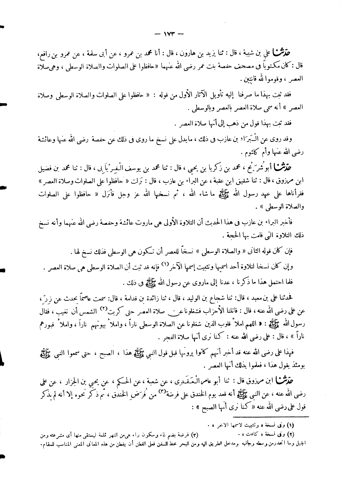 1028 - حَدَّثَنَا عَلِيُّ بْنُ شَيْبَةَ , قَالَ: ثنا يَزِيدُ بْنُ هَارُونَ , قَالَ: أنا مُحَمَّدُ بْنُ عَمْرٍو , عَنْ أَبِي سَلَمَةَ , عَنْ عَمْرِو بْنِ رَافِعٍ , قَالَ: «§كَانَ مَكْتُوبًا فِي مُصْحَفِ حَفْصَةَ بِنْتِ عُمَرَ رَضِيَ اللهُ عَنْهُمَا» حَافِظُوا عَلَى الصَّلَوَاتِ وَالصَّلَاةِ الْوُسْطَى وَهِيَ صَلَاةُ الْعَصْرِ وَقُومُوا لِلَّهِ قَانِتِينَ " فَقَدْ ثَبَتَ بِهَذَا مَا صَرَفْنَا إِلَيْهِ تَأْوِيلَ الْآثَارِ الْأُوَلِ مِنْ قَوْلِهِ: «حَافِظُوا عَلَى الصَّلَوَاتِ وَالصَّلَاةِ الْوُسْطَى وَصَلَاةِ الْعَصْرِ» أَنَّهُ سَمَّى صَلَاةَ الْعَصْرِ بِالْعَصْرِ وَبِالْوُسْطَى. فَقَدْ ثَبَتَ بِهَذَا قَوْلُ مَنْ ذَهَبَ إِلَى أَنَّهَا صَلَاةُ الْعَصْرِ. وَقَدْ رُوِيَ عَنِ الْبَرَاءِ بْنِ عَازِبٍ فِي ذَلِكَ , مَا يَدُلُّ عَلَى نَسْخِ مَا رُوِيَ فِي ذَلِكَ عَنْ حَفْصَةَ رَضِيَ اللهُ عَنْهَا وَعَائِشَةَ رَضِيَ اللهُ عَنْهَا وَأُمِّ كُلْثُومٍ