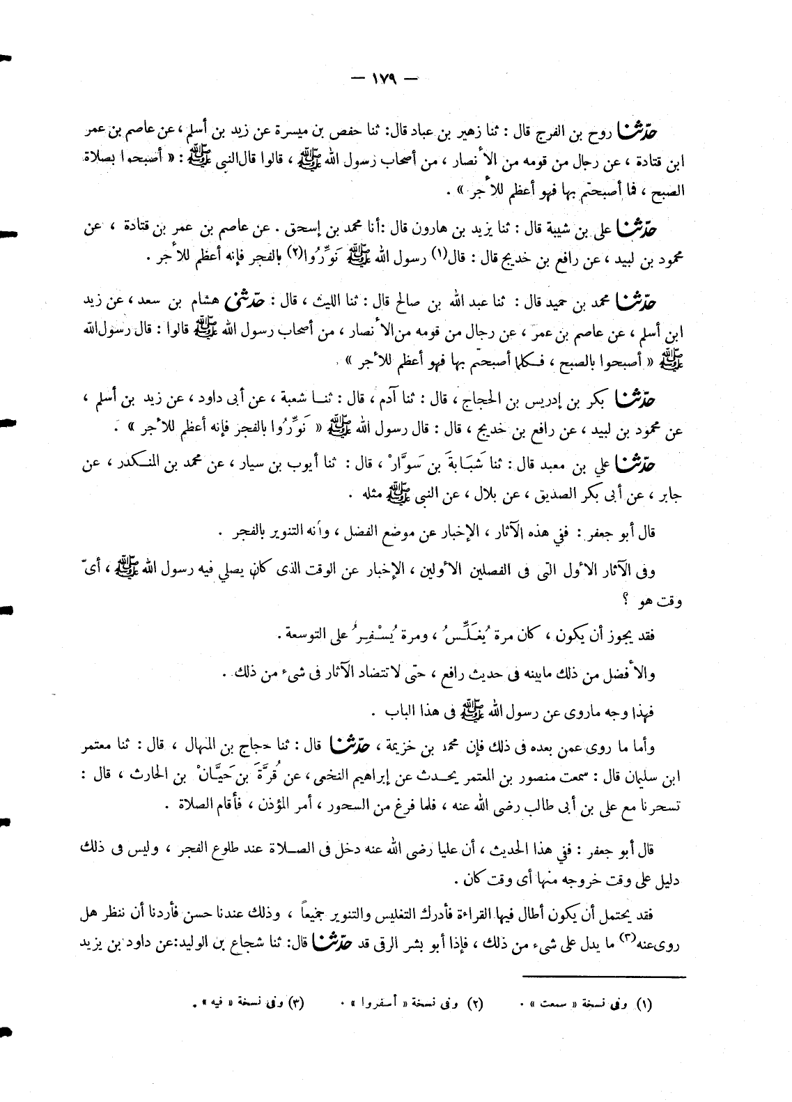 1067 - حَدَّثَنَا رَوْحُ بْنُ الْفَرَجِ قَالَ: ثنا زُهَيْرُ بْنُ عَبَّادٍ قَالَ: ثنا حَفْصُ بْنُ مَيْسَرَةَ عَنْ زَيْدِ بْنِ أَسْلَمَ , عَنْ عَاصِمِ بْنِ عُمَرَ بْنِ قَتَادَةَ , عَنْ رِجَالٍ مِنْ قَوْمِهِ مِنَ الْأَنْصَارِ , مِنْ أَصْحَابِ رَسُولِ اللهِ صَلَّى اللَّهُ عَلَيْهِ وَسَلَّمَ , قَالُوا: قَالَ النَّبِيُّ صَلَّى اللَّهُ عَلَيْهِ وَسَلَّمَ: «§أَصْبِحُوا بِصَلَاةِ الصُّبْحِ , فَمَا أَصْبَحْتُمْ بِهَا فَهُوَ أَعْظَمُ لِلْأَجْرِ»