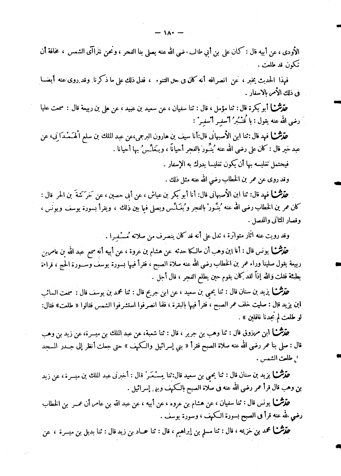 1076 - حَدَّثَنَا فَهْدٌ، قَالَ: ثنا ابْنُ الْأَصْبَهَانِيِّ، قَالَ: أنا أَبُو بَكْرِ بْنُ عَيَّاشٍ، عَنْ أَبِي حُصَيْنٍ، عَنْ خَرَشَةَ بْنِ الْحُرِّ، قَالَ: كَانَ عُمَرُ بْنُ الْخَطَّابِ رَضِيَ اللهُ عَنْهُ §يُنَوِّرُ بِالْفَجْرِ وَيُغَلِّسُ وَيُصَلِّي فِيمَا بَيْنَ ذَلِكَ , وَيَقْرَأُ بِسُورَةِ يُوسُفَ وَيُونُسَ , وَقِصَارِ الْمَثَانِي وَالْمُفَصَّلِ وَقَدْ رُوِيَتْ عَنْهُ آثَارٌ مُتَوَاتِرَةٌ , تَدُلُّ عَلَى أَنَّهُ قَدْ كَانَ يَنْصَرِفُ مِنْ صَلَاتِهِ مُسْفِرًا