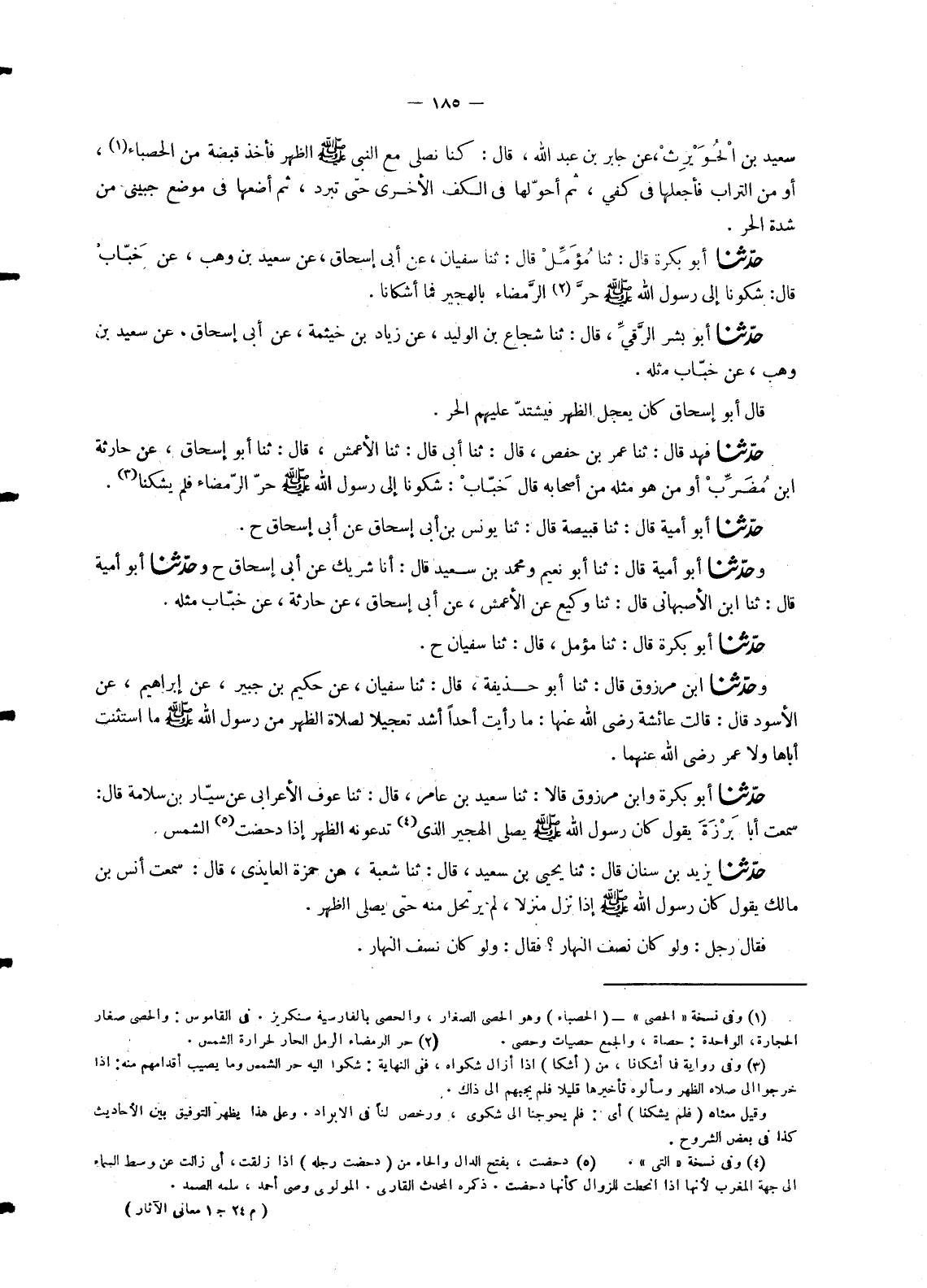 1101 - حَدَّثَنَا أَبُو بَكْرَةَ، قَالَ: ثنا مُؤَمَّلُ، قَالَ: ثنا سُفْيَانُ، عَنْ أَبِي إِسْحَاقَ، عَنْ سَعِيدِ بْنِ وَهْبٍ، عَنْ خَبَّابٍ، قَالَ: «§شَكَوْنَا إِلَى رَسُولِ اللهِ صَلَّى اللَّهُ عَلَيْهِ وَسَلَّمَ حَرَّ الرَّمْضَاءِ بِالْهَجِيرِ فَمَا أَشْكَانَا»