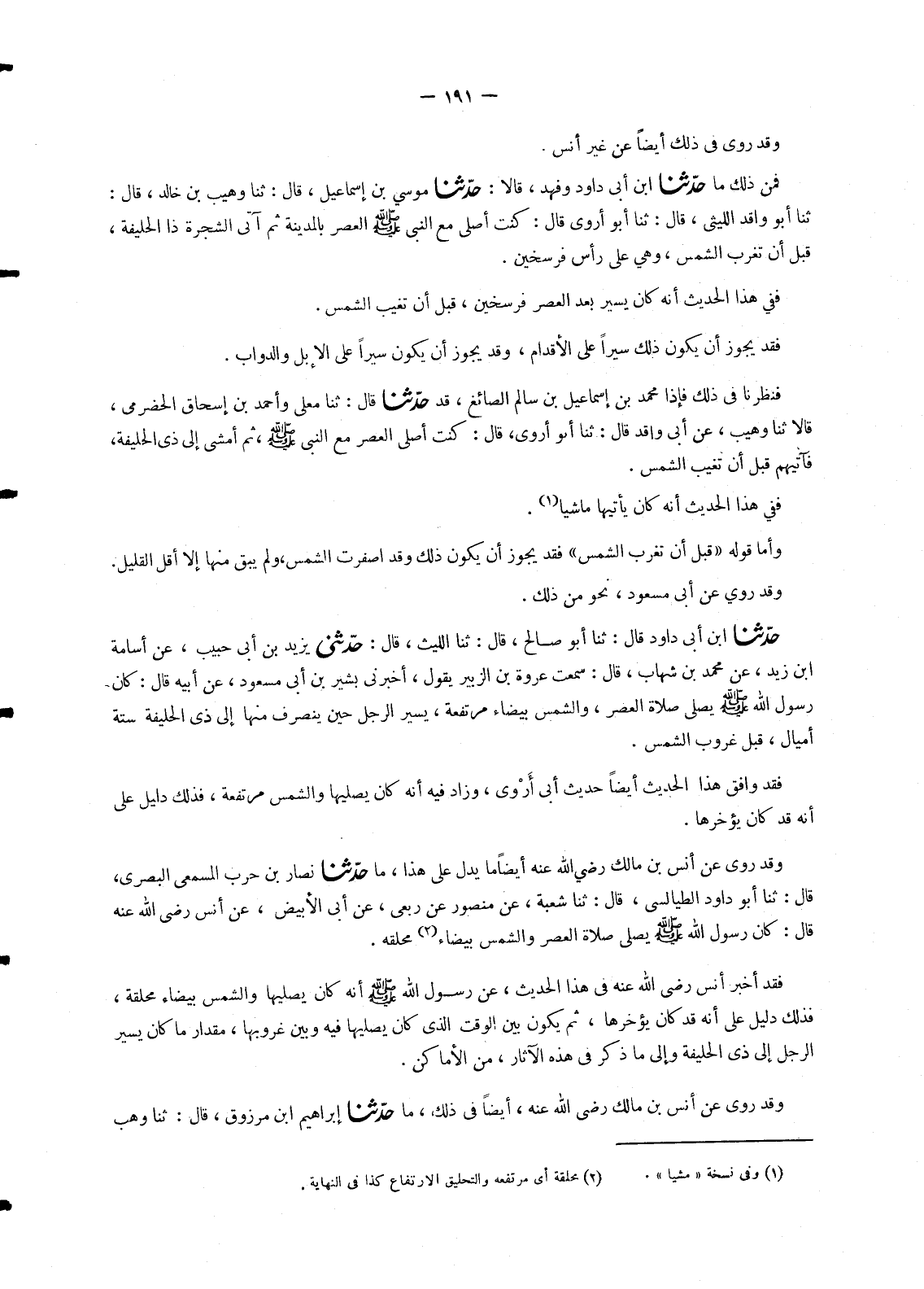 1142 - فَإِذَا مُحَمَّدُ بْنُ إِسْمَاعِيلَ بْنِ سَالِمٍ الصَّائِغُ , قَدْ حَدَّثَنَا قَالَ: ثنا مُعَلَّى وَأَحْمَدُ بْنُ إِسْحَاقَ الْحَضْرَمِيُّ، قَالَا ثنا وُهَيْبٌ , عَنْ أَبِي وَاقِدٍ قَالَ: ثنا أَبُو أَرْوَى , قَالَ: «§كُنْتُ أُصَلِّي الْعَصْرَ مَعَ النَّبِيِّ صَلَّى اللَّهُ عَلَيْهِ وَسَلَّمَ , ثُمَّ أَمْشِي إِلَى ذِي الْحُلَيْفَةِ , فَآتِيهِمْ قَبْلَ أَنْ تَغِيبَ الشَّمْسُ» فَفِي هَذَا الْحَدِيثِ أَنَّهُ كَانَ يَأْتِيهَا مَاشِيًا. وَأَمَّا قَوْلُهُ «قَبْلَ أَنْ تَغْرُبَ الشَّمْسُ» فَقَدْ يَجُوزُ أَنْ يَكُونَ ذَلِكَ وَقَدِ اصْفَرَّتِ الشَّمْسُ , وَلَمْ يَبْقَ مِنْهَا إِلَّا أَقَلُّ الْقَلِيلِ. وَقَدْ رُوِيَ عَنْ أَبِي مَسْعُودٍ , نَحْوٌ مِنْ ذَلِكَ