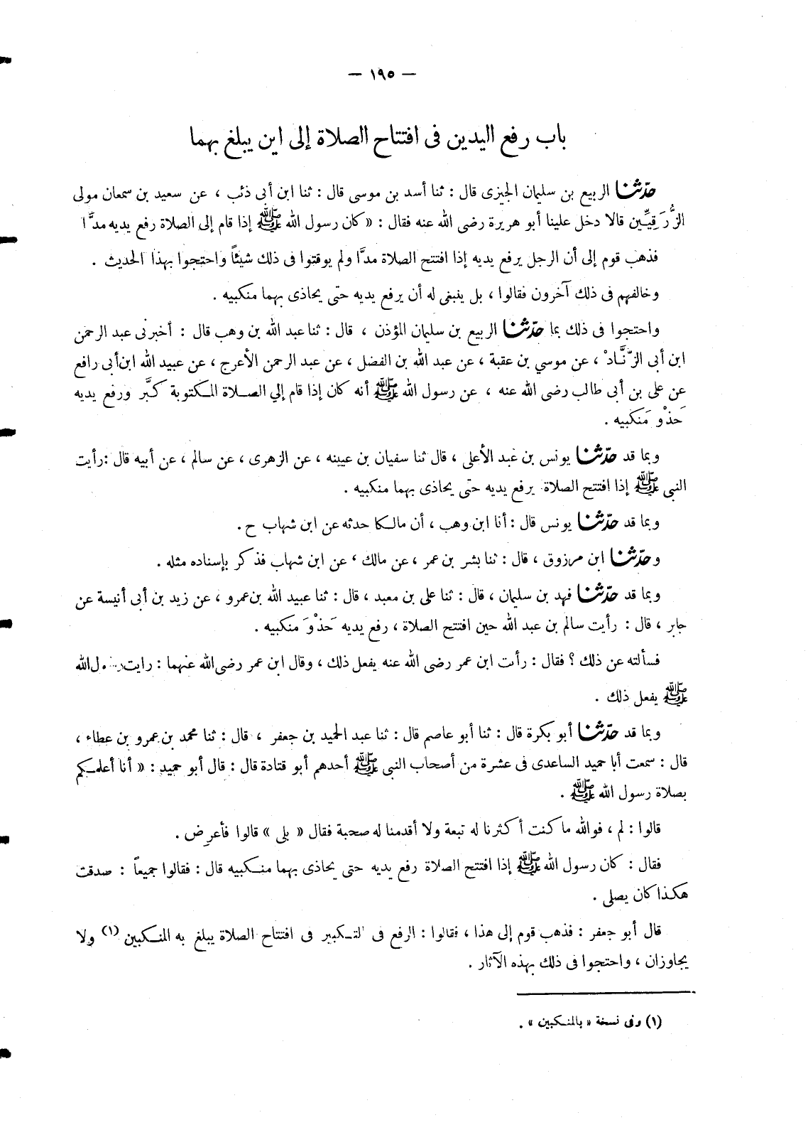 1162 - وَبِمَا قَدْ حَدَّثَنَا فَهْدُ بْنُ سُلَيْمَانَ , قَالَ: ثنا عَلِيُّ بْنُ مَعْبَدٍ , قَالَ: ثنا عُبَيْدِ اللهِ بْنُ عَمْرٍو , عَنْ زَيْدِ بْنِ أَبِي أُنَيْسَةَ عَنْ جَابِرٍ , قَالَ: رَأَيْتُ سَالِمَ بْنَ عَبْدِ اللهِ §حِينَ افْتَتَحَ الصَّلَاةَ , رَفَعَ يَدَيْهِ حَذْوَ مَنْكِبَيْهِ. فَسَأَلْتُهُ عَنْ ذَلِكَ؟ فَقَالَ: رَأَيْتُ ابْنَ عُمَرَ رَضِيَ اللهُ عَنْهُ يَفْعَلُ ذَلِكَ , وَقَالَ ابْنُ عُمَرَ رَضِيَ اللهُ عَنْهُمَا: «رَأَيْتُ رَسُولَ اللهِ صَلَّى اللَّهُ عَلَيْهِ وَسَلَّمَ يَفْعَلُ ذَلِكَ»