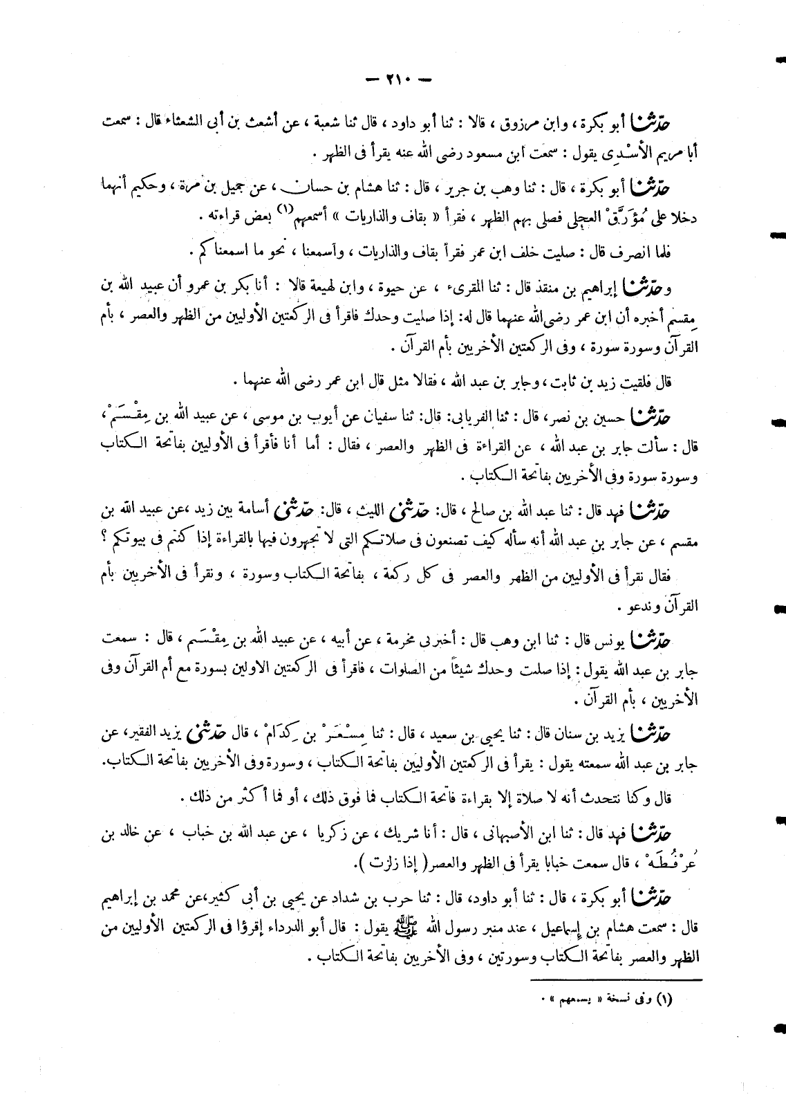 1246 - حَدَّثَنَا أَبُو بَكْرَةَ، قَالَ: ثنا وَهْبُ بْنُ جَرِيرٍ، قَالَ: ثنا هِشَامُ بْنُ حَسَّانَ، عَنْ جَمِيلِ بْنِ مُرَّةٍ، وَحَكِيمٍ أَنَّهُمَا دَخَلَا عَلَى مُوَرِّقٍ الْعِجْلِيِّ فَصَلَّى بِهِمُ الظُّهْرَ , فَقَرَأَ بِقَافِ وَالذَّارِيَاتِ أَسْمَعَهُمْ بَعْضَ قِرَاءَتِهِ. فَلَمَّا انْصَرَفَ قَالَ: «صَلَّيْتُ خَلْفَ ابْنِ عُمَرَ §فَقَرَأَ بِقَافِ وَالذَّارِيَاتِ , وَأَسْمَعَنَا , نَحْوَ مَا أَسْمَعْنَاكُمْ»
