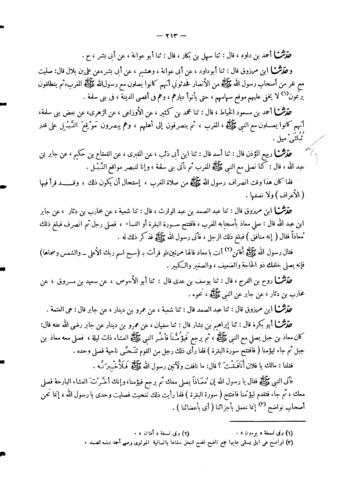 1272 - حَدَّثَنَا ابْنُ مَرْزُوقٍ، قَالَ: ثنا عَبْدُ الصَّمَدِ بْنُ عَبْدِ الْوَارِثِ، قَالَ: ثنا شُعْبَةُ، عَنْ مُحَارِبِ بْنِ دِثَارٍ، عَنْ جَابِرِ بْنِ عَبْدِ اللهِ، قَالَ: صَلَّى مُعَاذٌ بِأَصْحَابِهِ الْمَغْرِبَ , فَافْتَتَحَ سُورَةَ الْبَقَرَةِ أَوِ النِّسَاءِ , فَصَلَّى رَجُلٌ ثُمَّ انْصَرَفَ فَبَلَغَ ذَلِكَ مُعَاذًا فَقَالَ: إِنَّهُ مُنَافِقٌ فَبَلَغَ ذَلِكَ الرَّجُلَ , فَأَتَى رَسُولَ اللهِ صَلَّى اللَّهُ عَلَيْهِ وَسَلَّمَ فَذَكَرَ ذَلِكَ لَهُ , فَقَالَ رَسُولُ اللهِ صَلَّى اللَّهُ عَلَيْهِ وَسَلَّمَ: «أَفَاتِنٌ أَنْتَ يَا مُعَاذُ؟» قَالَهَا مَرَّتَيْنِ «§لَوْ قَرَأْتَ بِ سَبِّحِ اسْمَ رَبِّكَ الْأَعْلَى وَالشَّمْسِ وَضُحَاهَا فَإِنَّهُ يُصَلِّي خَلْفَكَ ذُوَالْحَاجَةِ وَالضَّعِيفُ , وَالصَّغِيرُ وَالْكَبِيرُ»
