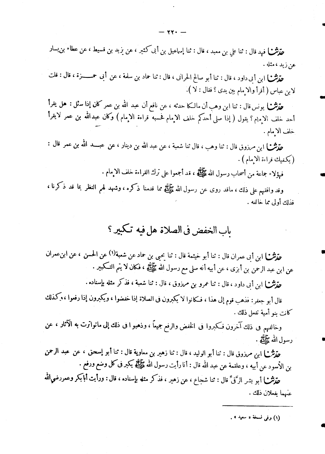 1320 - حَدَّثَنَا ابْنُ أَبِي دَاوُدَ، قَالَ: ثنا عَمْرُو بْنُ مَرْزُوقٍ، قَالَ: ثنا شُعْبَةُ، فَذَكَرَ مِثْلَهُ بِإِسْنَادِهِ قَالَ أَبُو جَعْفَرٍ: فَذَهَبَ قَوْمٌ إِلَى هَذَا , فَكَانُوا لَا يُكَبِّرُونَ فِي الصَّلَاةِ إِذَا خَفَضُوا , وَيُكَبِّرُونَ إِذَا رَفَعُوا , وَكَذَلِكَ كَانَتْ بَنُو أُمَيَّةَ تَفْعَلُ ذَلِكَ. وَخَالَفَهُمْ فِي ذَلِكَ آخَرُونَ فَكَبَّرُوا فِي الْخَفْضِ وَالرَّفْعِ جَمِيعًا , وَذَهَبُوا فِي ذَلِكَ إِلَى مَا تَوَاتَرَتْ بِهِ الْآثَارُ , عَنْ رَسُولِ اللهِ صَلَّى اللَّهُ عَلَيْهِ وَسَلَّمَ