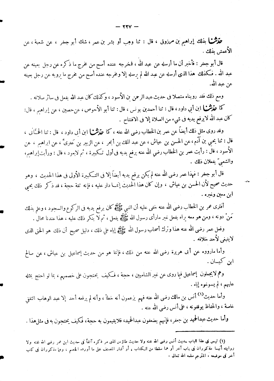 1364 - كَمَا حَدَّثَنَا ابْنُ أَبِي دَاوُدَ , قَالَ: ثنا الْحِمَّانِيُّ , قَالَ: ثنا يَحْيَى بْنُ آدَمَ , عَنِ الْحَسَنِ بْنِ عَيَّاشٍ , عَنْ عَبْدِ الْمَلِكِ بْنِ أَبْجَرَ , عَنِ الزُّبَيْرِ بْنِ عَدِيٍّ , عَنْ إِبْرَاهِيمَ , عَنِ الْأَسْوَدِ , قَالَ: رَأَيْتُ عُمَرَ بْنَ الْخَطَّابِ رَضِيَ اللهُ عَنْهُ §يَرْفَعُ يَدَيْهِ فِي أَوَّلِ تَكْبِيرَةٍ , ثُمَّ لَا يَعُودُ , قَالَ: وَرَأَيْتُ إِبْرَاهِيمَ , وَالشَّعْبِيَّ يَفْعَلَانِ ذَلِكَ " قَالَ أَبُو جَعْفَرٍ: فَهَذَا عُمَرُ رَضِيَ اللهُ عَنْهُ لَمْ يَكُنْ يَرْفَعُ يَدَيْهِ أَيْضًا إِلَّا فِي التَّكْبِيرَةِ الْأُولَى فِي هَذَا الْحَدِيثِ , وَهُوَ حَدِيثٌ صَحِيحٌ لِأَنَّ الْحَسَنَ بْنَ عَيَّاشٍ , وَإِنْ كَانَ هَذَا الْحَدِيثُ إِنَّمَا دَارَ عَلَيْهِ , فَإِنَّهُ ثِقَةٌ حُجَّةٌ , قَدْ ذَكَرَ ذَلِكَ يَحْيَى بْنُ مَعِينٍ وَغَيْرُهُ. أَفَتَرَى عُمَرُ بْنُ الْخَطَّابِ رَضِيَ اللهُ عَنْهُ خَفِيَ عَلَيْهِ أَنَّ النَّبِيَّ صَلَّى اللَّهُ عَلَيْهِ وَسَلَّمَ كَانَ يَرْفَعُ يَدَيْهِ فِي الرُّكُوعِ وَالسُّجُودِ , وَعَلِمَ بِذَلِكَ مَنْ دُونَهُ , وَمَنْ هُوَ مَعَهُ يَرَاهُ يَفْعَلُ غَيْرَ مَا رَأَى رَسُولُ اللهِ صَلَّى اللَّهُ عَلَيْهِ وَسَلَّمَ يَفْعَلُ , ثُمَّ لَا يُنْكِرُ ذَلِكَ عَلَيْهِ , هَذَا عِنْدَنَا مُحَالٌ. وَفَعَلَ عُمَرُ رَضِيَ اللهُ عَنْهُ هَذَا وَتَرَكَ أَصْحَابُ رَسُولِ اللهِ صَلَّى اللَّهُ عَلَيْهِ وَسَلَّمَ إِيَّاهُ عَلَى ذَلِكَ , دَلِيلٌ صَحِيحٌ أَنَّ ذَلِكَ هُوَ الْحَقُّ الَّذِي لَا يَنْبَغِي لِأَحَدٍ خِلَافُهُ. وَأَمَّا مَا رَوَوْهُ عَنْ أَبِي هُرَيْرَةَ رَضِيَ اللهُ عَنْهُ مِنْ ذَلِكَ , فَإِنَّمَا هُوَ مِنْ حَدِيثِ إِسْمَاعِيلَ بْنِ عَيَّاشٍ , عَنْ صَالِحِ بْنِ كَيْسَانَ. وَهُمْ لَا يَجْعَلُونَ إِسْمَاعِيلَ فِيمَا رُوِيَ عَنْ غَيْرِ الشَّامِيِّينَ , حَجَّةً , فَكَيْفَ يَحْتَجُّونَ عَلَى خَصْمِهِمْ , بِمَا لَوِ احْتَجَّ بِمِثْلِهِ عَلَيْهِمْ , لَمْ يُسَوِّغُوهُ إِيَّاهُ. وَأَمَّا حَدِيثُ أَنَسِ بْنِ مَالِكٍ رَضِيَ اللهُ عَنْهُ فَهُمْ يَزْعُمُونَ أَنَّهُ خَطَأٌ , وَأَنَّهُ لَمْ يَرْفَعْهُ أَحَدٌ إِلَّا عَبْدُ الْوَهَّابِ الثَّقَفِيُّ خَاصَّةً , وَالْحُفَّاظُ يُوقِفُونَهُ , عَلَى أَنَسٍ رَضِيَ اللهُ عَنْهُ. وَأَمَّا حَدِيثُ عَبْدِ الْحَمِيدِ بْنِ جَعْفَرٍ , فَإِنَّهُمْ يُضَعِّفُونَ عَبْدَ الْحَمِيدِ , فَلَا يُقِيمُونَ بِهِ حُجَّةً , فَكَيْفَ يَحْتَجُّونَ بِهِ فِي مِثْلِ هَذَا. -[228]- وَمَعَ ذَلِكَ فَإِنَّ مُحَمَّدَ بْنَ عَمْرِو بْنِ عَطَاءٍ لَمْ يَسْمَعْ ذَلِكَ الْحَدِيثَ مِنْ أَبِي حُمَيْدٍ , وَلَا مِمَّنْ ذُكِرَ مَعَهُ فِي ذَلِكَ الْحَدِيثِ بَيْنَهُمَا رَجُلٌ مَجْهُولٌ , قَدْ ذَكَرَ ذَلِكَ الْعَطَّافُ بْنُ خَالِدٍ عَنْهُ , عَنْ رَجُلٍ , وَأَنَا ذَاكِرٌ ذَلِكَ فِي بَابِ الْجُلُوسِ فِي الصَّلَاةِ إِنْ شَاءَ اللهُ تَعَالَى. وَحَدِيثُ أَبِي عَاصِمٍ , عَنْ عَبْدِ الْحَمِيدِ هَذَا , فَفِيهِ فَقَالُوا جَمِيعًا: صَدَقْتَ فَلَيْسَ يَقُولُ ذَلِكَ أَحَدٌ غَيْرُ أَبِي عَاصِمٍ ,