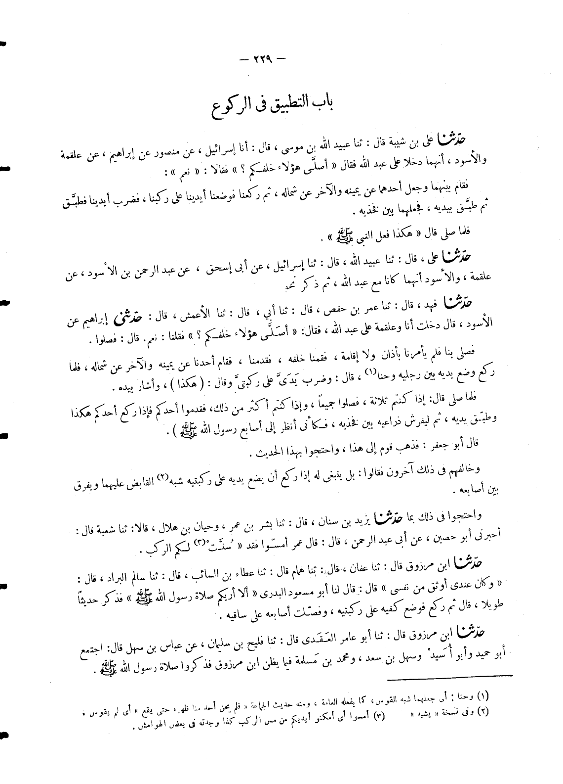 1370 - حَدَّثَنَا فَهْدٌ , قَالَ: ثنا عُمَرُ بْنُ حَفْصٍ , قَالَ: ثنا أَبِي , قَالَ: ثنا الْأَعْمَشُ , قَالَ: حَدَّثَنِي إِبْرَاهِيمُ عَنِ الْأَسْوَدِ قَالَ: دَخَلْتُ أَنَا وَعَلْقَمَةُ عَلَى عَبْدِ اللهِ , فَقَالَ: «أَصَلَّى هَؤُلَاءِ خَلْفَكُمْ؟» فَقُلْنَا: نَعَمْ. قَالَ: فَصَلُّوا فَصَلَّى بِنَا فَلَمْ يَأْمُرْنَا بِأَذَانٍ وَلَا إِقَامَةٍ , فَقُمْنَا خَلْفَهُ , فَقَدَّمَنَا , فَقَامَ أَحَدُنَا عَنْ يَمِينِهِ وَالْآخَرُ عَنْ شِمَالِهِ , فَلَمَّا رَكَعَ وَضَعَ يَدَيْهِ بَيْنَ رِجْلَيْهِ وَحَنَا , قَالَ: وَضَرَبَ يَدَيَّ عَلَى رُكْبَتَيْ وَقَالَ: هَكَذَا , وَأَشَارَ بِيَدِهِ. فَلَمَّا صَلَّى قَالَ: «§إِذَا كُنْتُمْ ثَلَاثَةَ , فَصَلُّوا جَمِيعًا , وَإِذَا كُنْتُمْ أَكْثَرَ مِنْ ذَلِكَ , فَقَدِّمُوا أَحَدَكُمْ فَإِذَا رَكَعَ أَحَدُكُمْ هَكَذَا وَطَبَّقَ يَدَيْهِ , ثُمَّ لِيَفْرِشْ ذِرَاعَيْهِ بَيْنَ فَخِذَيْهِ , فَكَأَنِّي أَنْظُرُ إِلَى أَصَابِعِ رَسُولِ اللهِ صَلَّى اللَّهُ عَلَيْهِ وَسَلَّمَ» قَالَ أَبُو جَعْفَرٍ: فَذَهَبَ قَوْمٌ إِلَى هَذَا , وَاحْتَجُّوا بِهَذَا الْحَدِيثِ. وَخَالَفَهُمْ فِي ذَلِكَ آخَرُونَ فَقَالُوا: بَلْ يَنْبَغِي لَهُ إِذَا رَكَعَ أَنْ يَضَعَ يَدَيْهِ عَلَى رُكْبَتَيْهِ شَبَهُ الْقَابِضِ عَلَيْهِمَا وَيُفَرِّقُ بَيْنَ أَصَابِعِهِ. وَاحْتَجُّوا فِي ذَلِكَ
