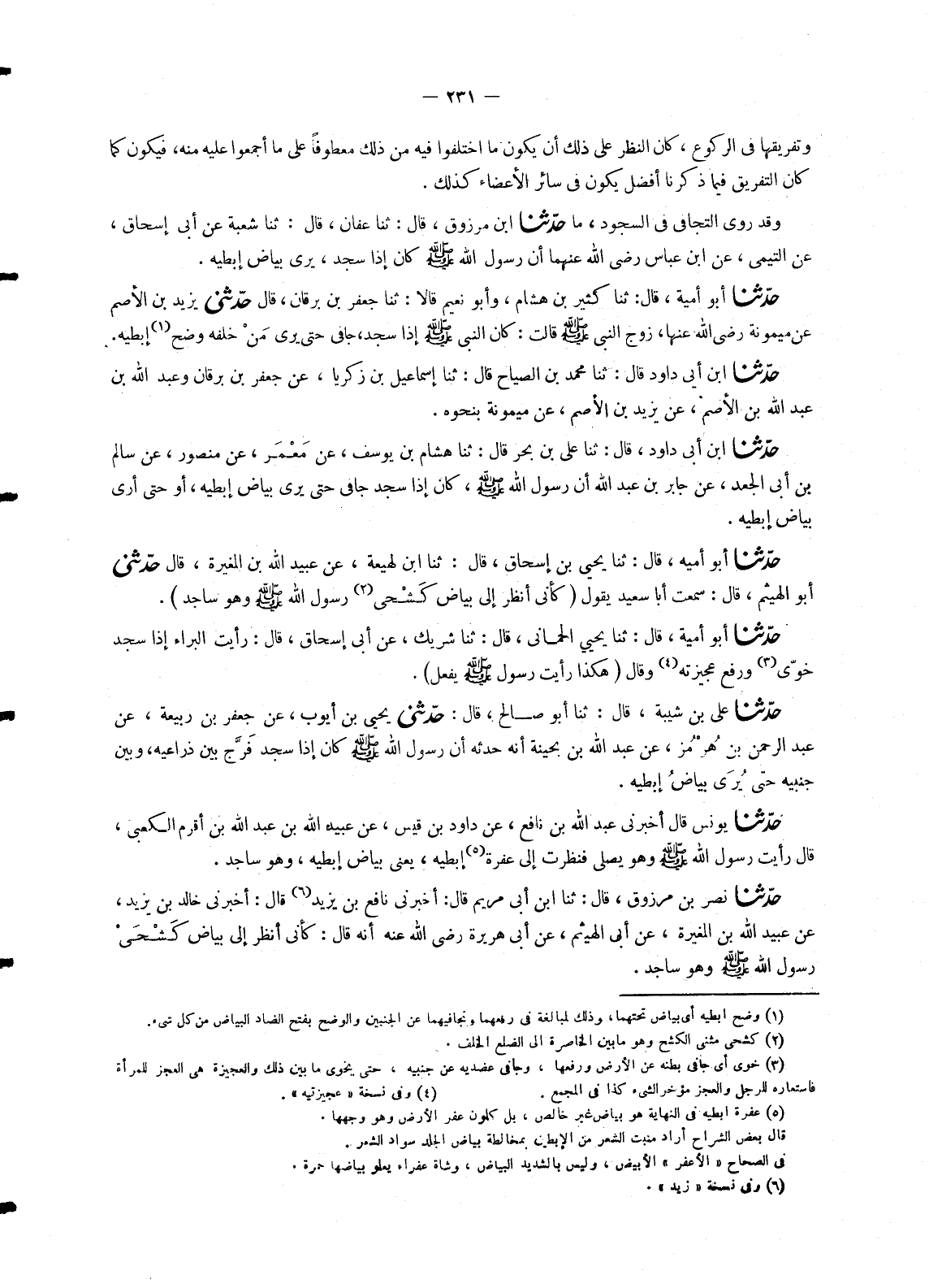 1380 - مَا حَدَّثَنَا ابْنُ مَرْزُوقٍ , قَالَ: ثنا عَفَّانُ , قَالَ: ثنا شُعْبَةُ عَنْ أَبِي إِسْحَاقَ , عَنِ التَّيْمِيِّ , عَنِ ابْنِ عَبَّاسٍ رَضِيَ اللهُ عَنْهُمَا «أَنَّ رَسُولَ اللهِ صَلَّى اللَّهُ عَلَيْهِ وَسَلَّمَ كَانَ §إِذَا سَجَدَ يُرَى بَيَاضُ إِبْطَيْهِ»
