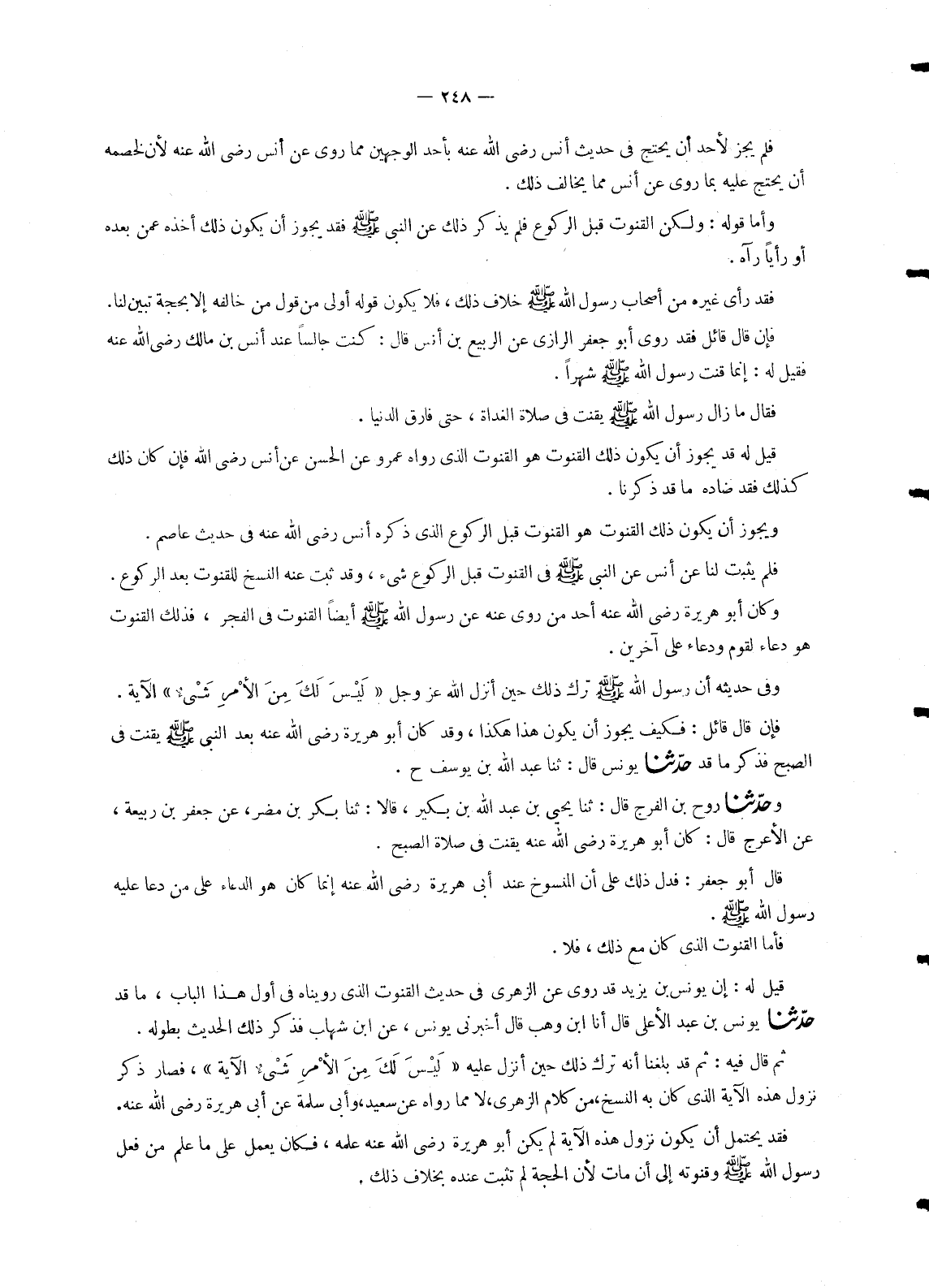 1473 - مَا قَدْ حَدَّثَنَا يُونُسُ بْنُ عَبْدِ الْأَعْلَى قَالَ: أَنَا ابْنُ وَهْبٍ قَالَ: أَخْبَرَنِي يُونُسُ , عَنِ ابْنِ شِهَابٍ فَذَكَرَ ذَلِكَ الْحَدِيثَ بِطُولِهِ. ثُمَّ قَالَ فِيهِ: ثُمَّ قَدْ بَلَغَنَا أَنَّهُ تَرَكَ ذَلِكَ حِينَ أُنْزِلَ عَلَيْهِ {لَيْسَ لَكَ مِنَ الْأَمْرِ شَيْءٌ} [آل عمران: 128] الْآيَةَ , فَصَارَ ذِكْرُ نُزُولِ هَذِهِ الْآيَةِ الَّذِي كَانَ بِهِ النَّسْخُ , مِنْ كَلَامِ الزُّهْرِيِّ , لَا مِمَّا رَوَاهُ عَنْ سَعِيدٍ , وَأَبِي سَلَمَةَ عَنْ أَبِي هُرَيْرَةَ رَضِيَ اللهُ عَنْهُ. فَقَدْ يُحْتَمَلُ أَنْ يَكُونَ نُزُولُ هَذِهِ الْآيَةِ لَمْ يَكُنْ أَبُو هُرَيْرَةَ رَضِيَ اللهُ عَنْهُ عَلِمَهُ , فَكَانَ يَعْمَلُ عَلَى مَا عَلِمَ مِنْ فِعْلِ رَسُولِ اللهِ صَلَّى اللَّهُ عَلَيْهِ وَسَلَّمَ وَقُنُوتِهِ إِلَى أَنْ مَاتَ لِأَنَّ الْحُجَّةَ لَمْ تَثْبُتْ عِنْدَهُ بِخِلَافِ ذَلِكَ. -[249]- وَعَلِمَ عَبْدُ اللهِ بْنُ عُمَرَ رَضِيَ اللهُ عَنْهُمَا وَعَبْدُ الرَّحْمَنِ بْنُ أَبِي بَكْرٍ أَنَّ نُزُولَ هَذِهِ الْآيَةِ كَانَ نَسْخًا لِمَا كَانَ رَسُولُ اللهِ صَلَّى اللَّهُ عَلَيْهِ وَسَلَّمَ يَفْعَلُهُ فَانْتَهَيَا إِلَى ذَلِكَ وَتَرَكَا بِهِ الْمَنْسُوخَ الْمُتَقَدِّمَ. وَحُجَّةٌ أُخْرَى أَنَّ فِي حَدِيثِ ابْنِ إِيمَاءٍ " أَنَّ رَسُولَ اللهِ صَلَّى اللَّهُ عَلَيْهِ وَسَلَّمَ قَالَ: حِينَ رَفَعَ رَأْسَهُ مِنَ الرَّكْعَةِ غِفَارٌ غَفَرَ اللهُ لَهَا " حَتَّى ذَكَرَ مَا ذَكَرَ فِي حَدِيثِهِ ثُمَّ قَالَ: «اللهُ أَكْبَرُ» وَخَرَّ سَاجِدًا. فَثَبَتَ بِذَلِكَ أَنَّ جَمِيعَ مَا كَانَ يَقُولُهُ هُوَ مَا تَرَكَ بِنُزُولِ تِلْكَ الْآيَةِ وَمَا كَانَ يَدْعُو بِهِ مَعَ ذَلِكَ مِنْ دُعَائِهِ لِلْأَسْرَى الَّذِينَ كَانُوا بِمَكَّةَ , ثُمَّ تَرَكَ ذَلِكَ عِنْدَمَا قَدِمُوا، وَقَدْ رَوَى أَبُو هُرَيْرَةَ رَضِيَ اللهُ عَنْهُ أَيْضًا , فِي حَدِيثِ يَحْيَى بْنِ كَثِيرٍ الَّذِي قَدْ رَوَيْنَاهُ فِيمَا تَقَدَّمَ مِنَّا فِي هَذَا الْبَابِ عَنْهُ , عَنْ أَبِي سَلَمَةَ , عَنْ أَبِي هُرَيْرَةَ رَضِيَ اللهُ عَنْهُ , فَذَكَرَ الْقُنُوتَ. وَفِيهِ قَالَ أَبُو هُرَيْرَةَ رَضِيَ اللهُ عَنْهُ وَأَصْبَحَ ذَاتَ يَوْمٍ وَلَمْ يَدْعُ لَهُمْ فَذَكَرْتُ ذَلِكَ فَقَالَ: «أَوَ مَا تَرَاهُمْ قَدْ قَدِمُوا عَلَيَّ؟» فَفِي ذَلِكَ أَنَّ رَسُولَ اللهِ صَلَّى اللَّهُ عَلَيْهِ وَسَلَّمَ كَانَ يَقُولُ ذَلِكَ الْقُنُوتَ فِي الْعِشَاءِ الْآخِرَةِ , كَمَا كَانَ يَقُولُهُ فِي الصُّبْحِ , وَقَدْ أَجْمَعُوا أَنَّ ذَلِكَ مَنْسُوخٌ مِنْ صَلَاةِ الْعِشَاءِ الْآخِرَةِ بِكَمَالِهِ لَا إِلَى قُنُوتٍ غَيْرِهِ , فَالْفَجْرُ أَيْضًا فِي النَّسْخِ كَذَلِكَ. فَلَمَّا كَشَفْنَا وُجُوهَ هَذِهِ الْآثَارِ الْمَرْوِيَّةِ عَنْ رَسُولِ اللهِ صَلَّى اللَّهُ عَلَيْهِ وَسَلَّمَ فِي الْقُنُوتِ , فَلَمْ نَجِدْهَا تَدُلُّ عَلَى وُجُوبِهِ الْآنَ فِي صَلَاةِ الْفَجْرِ لَمْ نَأْمُرْ بِهِ فِيهَا وَأَمَرْنَا بِتَرْكِهِ , مَعَ أَنَّ بَعْضَ أَصْحَابِ رَسُولِ اللهِ صَلَّى اللَّهُ عَلَيْهِ وَسَلَّمَ قَدْ أَنْكَرَهُ أَصْلًا