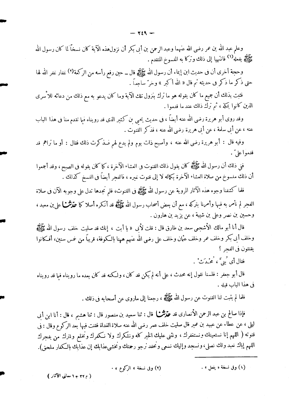 1475 -قَدْ حَدَّثَنَا قَالَ: ثنا سَعِيدُ بْنُ مَنْصُورٍ قَالَ: ثنا هُشَيْمٌ , قَالَ: أنا ابْنُ أَبِي لَيْلَى , عَنْ عَطَاءٍ عَنْ عُبَيْدِ بْنِ عُمَيْرٍ قَالَ: صَلَّيْتُ خَلْفَ عُمَرَ رَضِيَ اللهُ عَنْهُ صَلَاةَ الْغَدَاةِ §فَقَنَتَ فِيهَا بَعْدَ الرُّكُوعِ وَقَالَ فِي قُنُوتِهِ: «اللهُمَّ إِنَّا نَسْتَعِينُكَ وَنَسْتَغْفِرُكَ , وَنُثْنِي عَلَيْكَ الْخَيْرَ كُلَّهُ وَنَشْكُرُكَ وَلَا نَكْفُرُكَ وَنَخْلَعُ وَنَتْرُكُ مَنْ يَفْجُرُكَ اللهُمَّ إِيَّاكَ نَعْبُدُ وَلَكَ نُصَلِّي , وَنَسْجُدُ وَإِلَيْكَ نَسْعَى وَنَحْفِدُ نَرْجُو رَحْمَتَكَ وَنَخْشَى عَذَابَكَ إِنَّ عَذَابَكَ بِالْكُفَّارِ مُلْحِقٌ» -[250]-