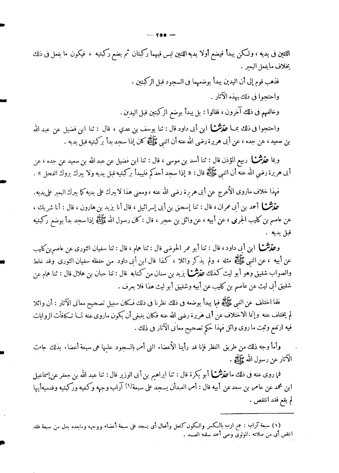 1520 - كَذَلِكَ حَدَّثَنَا يَزِيدُ بْنُ سِنَانٍ مِنْ كِتَابِهِ قَالَ: ثنا حَبَّانُ بْنُ هِلَالٍ قَالَ: ثنا هَمَّامٌ عَنْ شَقِيقٍ أَبِي لَيْثٍ عَنْ عَاصِمِ بْنِ كُلَيْبٍ عَنْ أَبِيهِ وَشَقِيقٌ أَبُو لَيْثٍ هَذَا فَلَا يُعْرَفُ. فَلَمَّا اخْتُلِفَ عَنِ النَّبِيِّ صَلَّى اللَّهُ عَلَيْهِ وَسَلَّمَ فِيمَا يَبْدَأُ بِوَضْعِهِ فِي ذَلِكَ نَظَرْنَا فِي ذَلِكَ فَكَانَ سَبِيلُ تَصْحِيحِ مَعَانِي الْآثَارِ: أَنَّ وَائِلًا لَمْ يُخْتَلَفْ عَنْهُ وَإِنَّمَا الِاخْتِلَافُ عَنْ أَبِي هُرَيْرَةَ رَضِيَ اللهُ عَنْهُ فَكَانَ يَنْبَغِي أَنْ يَكُونَ مَا رُوِيَ عَنْهُ لَمَّا تَكَافَأَتِ الرِّوَايَاتُ فِيهِ ارْتَفَعَ وَثَبَتَ مَا رَوَى وَائِلٌ فَهَذَا حُكْمُ تَصْحِيحِ مَعَانِي الْآثَارِ فِي ذَلِكَ. وَأَمَّا وَجْهُ ذَلِكَ مِنْ طَرِيقِ النَّظَرِ فَإِنَّا قَدْ رَأَيْنَا الْأَعْضَاءَ الَّتِي أُمِرَ بِالسُّجُودِ عَلَيْهَا هِيَ سَبْعَةُ أَعْضَاءٍ بِذَلِكَ جَاءَتِ الْآثَارُ عَنْ رَسُولِ اللهِ صَلَّى اللَّهُ عَلَيْهِ وَسَلَّمَ. فَمِمَّا رُوِيَ عَنْهُ فِي ذَلِكَ