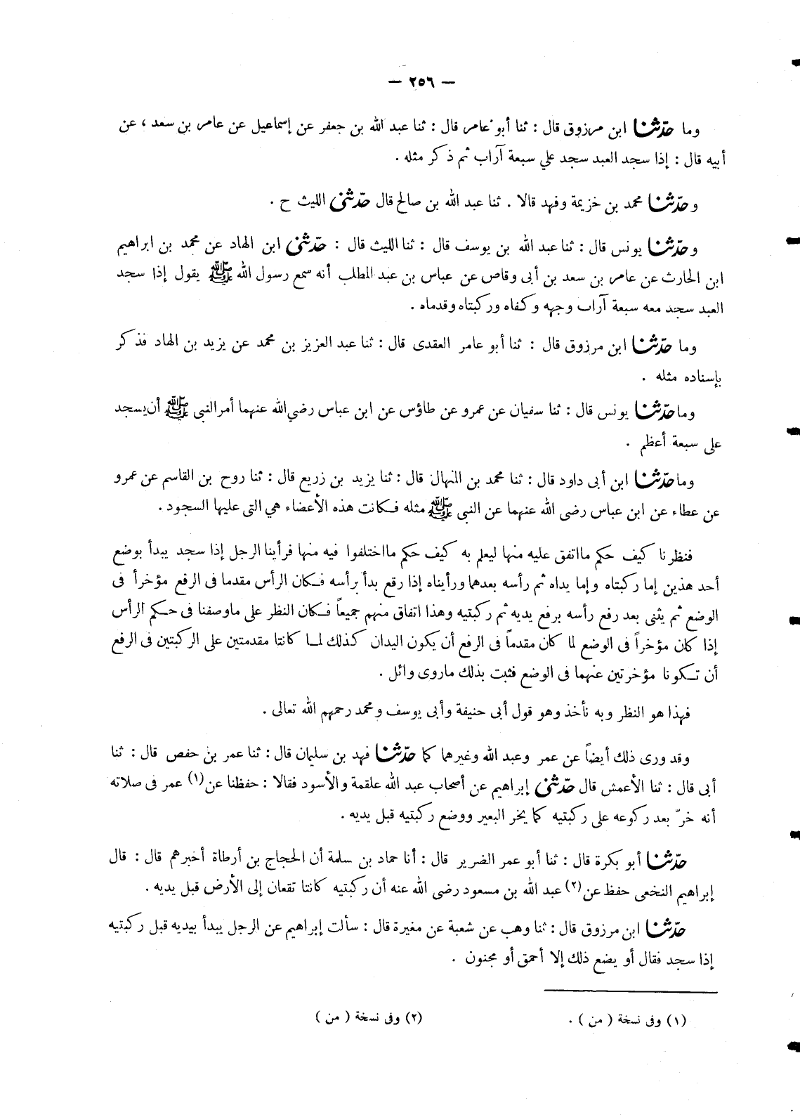 1527 - وَمَا حَدَّثَنَا ابْنُ أَبِي دَاوُدَ قَالَ: ثنا مُحَمَّدُ بْنُ الْمِنْهَالِ قَالَ: ثنا يَزِيدُ بْنُ زُرَيْعٍ قَالَ: ثنا رَوْحُ بْنُ الْقَاسِمِ عَنْ عَمْرٍو عَنْ عَطَاءٍ عَنِ ابْنِ عَبَّاسٍ رَضِيَ اللهُ عَنْهُمَا عَنِ النَّبِيِّ صَلَّى اللَّهُ عَلَيْهِ وَسَلَّمَ مِثْلَهُ فَكَانَتْ هَذِهِ الْأَعْضَاءُ هِيَ الَّتِي عَلَيْهَا السُّجُودُ. فَنَظَرْنَا كَيْفَ حُكْمُ مَا اتُّفِقَ عَلَيْهِ مِنْهَا لِيُعْلَمَ بِهِ كَيْفَ حُكْمُ مَا اخْتَلَفُوا فِيهِ مِنْهَا فَرَأَيْنَا الرَّجُلَ إِذَا سَجَدَ يَبْدَأُ بِوَضْعِ أَحَدِ هَذَيْنِ إِمَّا رُكْبَتَاهُ وَإِمَّا يَدَاهُ ثُمَّ رَأْسُهُ بَعْدُهُمَا وَرَأَيْنَاهُ إِذَا رَفَعَ بَدَأَ بِرَأْسِهِ فَكَانَ الرَّأْسُ مُقَدَّمًا فِي الرَّفْعِ مُؤَخَّرًا فِي الْوَضْعِ ثُمَّ يُثَنِّي بَعْدَ رَفْعِ رَأْسِهِ بِرَفْعِ يَدَيْهِ ثُمَّ رُكْبَتَيْهِ وَهَذَا اتِّفَاقٌ مِنْهُمْ جَمِيعًا فَكَانَ النَّظَرُ عَلَى مَا وَصَفْنَا فِي حُكْمِ الرَّأْسِ إِذَا كَانَ مُؤَخَّرًا فِي الْوَضْعِ لَمَّا كَانَ مُقَدَّمًا فِي الرَّفْعِ أَنْ يَكُونَ الْيَدَانِ كَذَلِكَ لَمَّا كَانَتَا مُقَدَّمَتَيْنِ عَلَى الرُّكْبَتَيْنِ فِي الرَّفْعِ أَنْ تَكُونَا مُؤَخَّرَتَيْنِ عَنْهُمَا فِي الْوَضْعِ فَثَبَتَ بِذَلِكَ مَا رَوَى وَائِلٌ. فَهَذَا هُوَ النَّظَرُ وَبِهِ نَأْخُذُ وَهُوَ قَوْلُ أَبِي حَنِيفَةَ وَأَبِي يُوسُفَ وَمُحَمَّدٍ رَحِمَهُمُ اللهُ تَعَالَى. وَقَدْ رُوِيَ ذَلِكَ أَيْضًا عَنْ عُمَرَ وَعَبْدِ اللهِ وَغَيْرِهِمَا