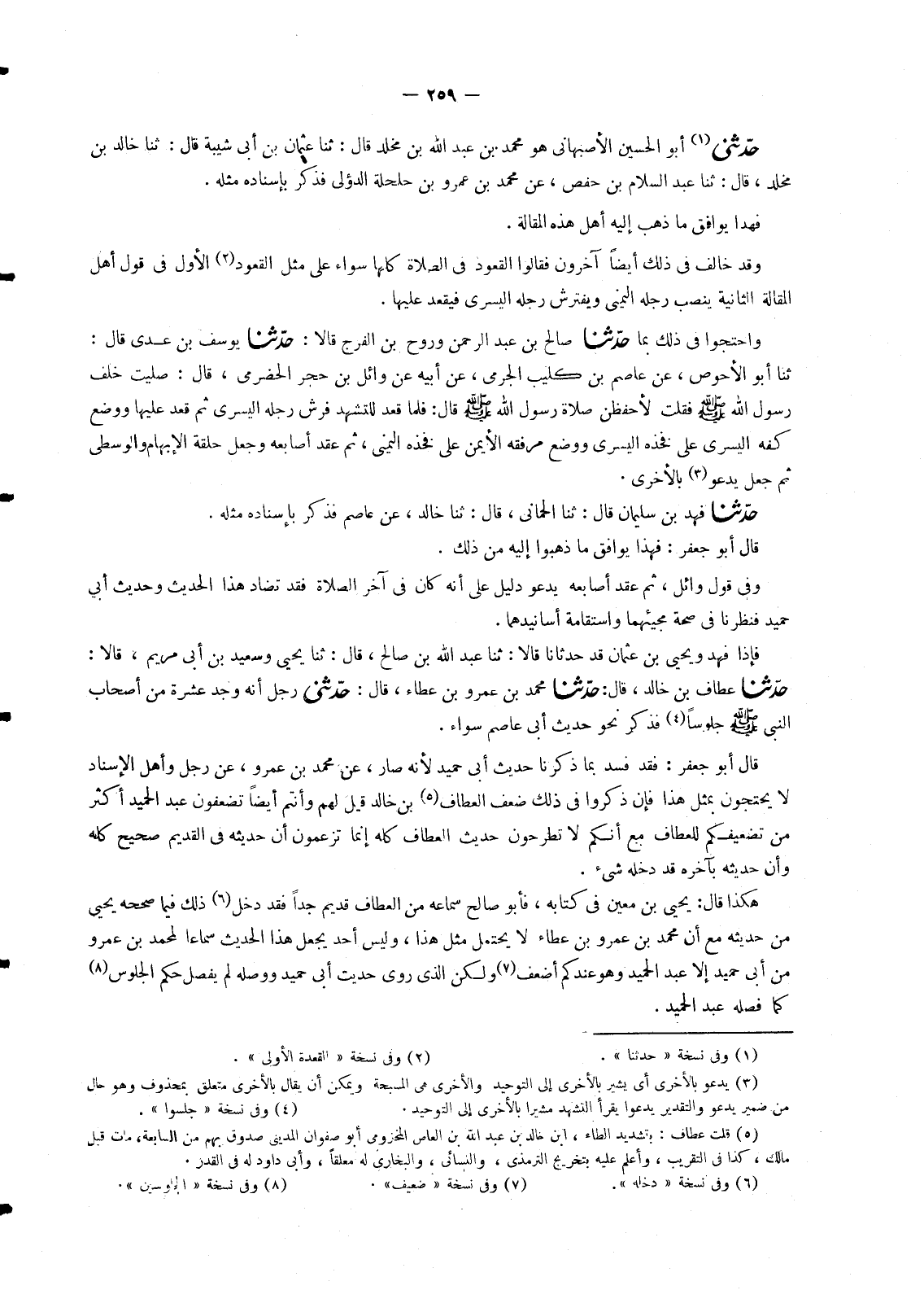 1544 - حَدَّثَنَا عَطَّافُ بْنُ خَالِدٍ , قَالَ: حَدَّثَنَا مُحَمَّدُ بْنُ عَمْرِو بْنِ عَطَاءٍ , قَالَ: حَدَّثَنِي رَجُلٌ أَنَّهُ وَجَدَ عَشَرَةً مِنْ أَصْحَابِ النَّبِيِّ صَلَّى اللَّهُ عَلَيْهِ وَسَلَّمَ جُلُوسًا فَذَكَرَ نَحْوَ حَدِيثِ أَبِي عَاصِمٍ سَوَاءً. قَالَ أَبُو جَعْفَرٍ: فَقَدْ فَسَدَ بِمَا ذَكَرْنَا حَدِيثُ أَبِي حُمَيْدٍ ; لِأَنَّهُ صَارَ , عَنْ مُحَمَّدِ بْنِ عَمْرٍو , عَنْ رَجُلٍ , وَأَهْلُ الْإِسْنَادِ لَا يَحْتَجُّونَ بِمِثْلِ هَذَا فَإِنْ ذَكَرُوا فِي ذَلِكَ ضَعْفَ الْعَطَّافِ بْنِ خَالِدٍ قِيلَ لَهُمْ: وَأَنْتُمْ أَيْضًا تُضَعِّفُونَ عَبْدَ الْحَمِيدِ أَكْثَرَ مِنْ تَضْعِيفِكُمْ لِلْعَطَّافِ مَعَ أَنَّكُمْ لَا تَطْرَحُونَ حَدِيثَ الْعَطَّافِ كُلَّهُ إِنَّمَا تَزْعُمُونَ أَنَّ حَدِيثَهُ فِي الْقَدِيمِ صَحِيحٌ كُلُّهُ وَأَنَّ حَدِيثَهُ بِآخِرِهِ قَدْ دَخَلَهُ شَيْءٌ. هَكَذَا قَالَ يَحْيَى بْنُ مَعِينٍ فِي كِتَابِهِ , فَأَبُو صَالِحٍ سَمَاعُهُ مِنَ الْعَطَّافِ قَدِيمٌ جِدًّا فَقَدْ دَخَلَ ذَلِكَ فِيمَا صَحَّحَهُ يَحْيَى مِنْ حَدِيثِهِ مَعَ أَنَّ مُحَمَّدَ بْنَ عَمْرِو بْنِ عَطَاءٍ لَا يَحْتَمِلُ مِثْلَ هَذَا , وَلَيْسَ أَحَدٌ يَجْعَلُ هَذَا الْحَدِيثَ سَمَاعًا لِمُحَمَّدِ بْنِ عَمْرٍو مِنْ أَبِي حُمَيْدٍ إِلَّا عَبْدَ الْحَمِيدِ وَهُوَ عِنْدَكُمْ أَضْعَفُ وَلَكِنَّ الَّذِي رَوَى حَدِيثَ أَبِي حُمَيْدٍ وَوَصَلَهُ لَمْ يُفَصِّلْ حُكْمَ الْجُلُوسِ كَمَا فَصَّلَهُ عَبْدُ الْحَمِيدِ