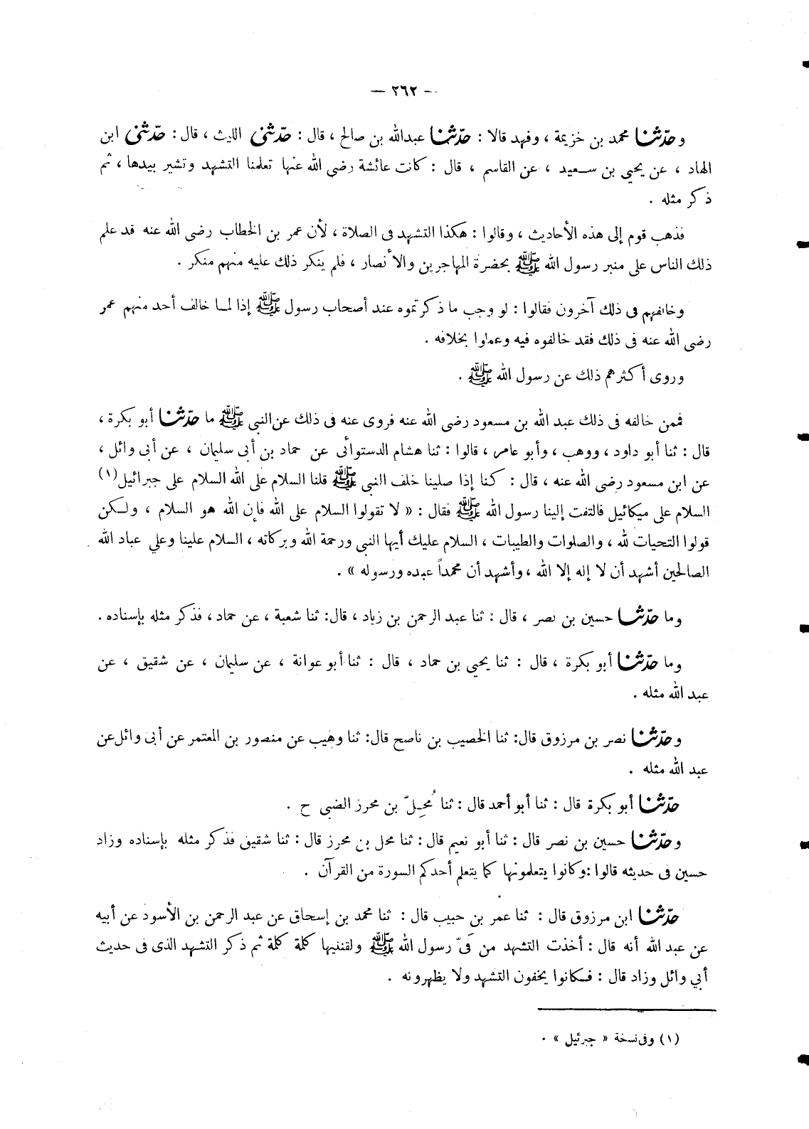 1562 - حَدَّثَنَا ابْنُ مَرْزُوقٍ، قَالَ: ثنا عُمَرُ بْنُ حَبِيبٍ، قَالَ: ثنا مُحَمَّدُ بْنُ إِسْحَاقَ، عَنْ عَبْدِ الرَّحْمَنِ بْنِ الْأَسْوَدِ، عَنْ أَبِيهِ، عَنْ عَبْدِ اللهِ، أَنَّهُ قَالَ: «أَخَذْتُ التَّشَهُّدَ مِنْ فِي رَسُولِ اللهِ صَلَّى اللَّهُ عَلَيْهِ وَسَلَّمَ وَلَقَّنَنِيهَا كَلِمَةً كَلِمَةً» ثُمَّ ذَكَرَ التَّشَهُّدَ الَّذِي فِي حَدِيثِ أَبِي وَائِلٍ وَزَادَ قَالَ: «فَكَانُوا يُخْفُونَ التَّشَهُّدَ وَلَا يُظْهِرُونَهُ» -[263]-