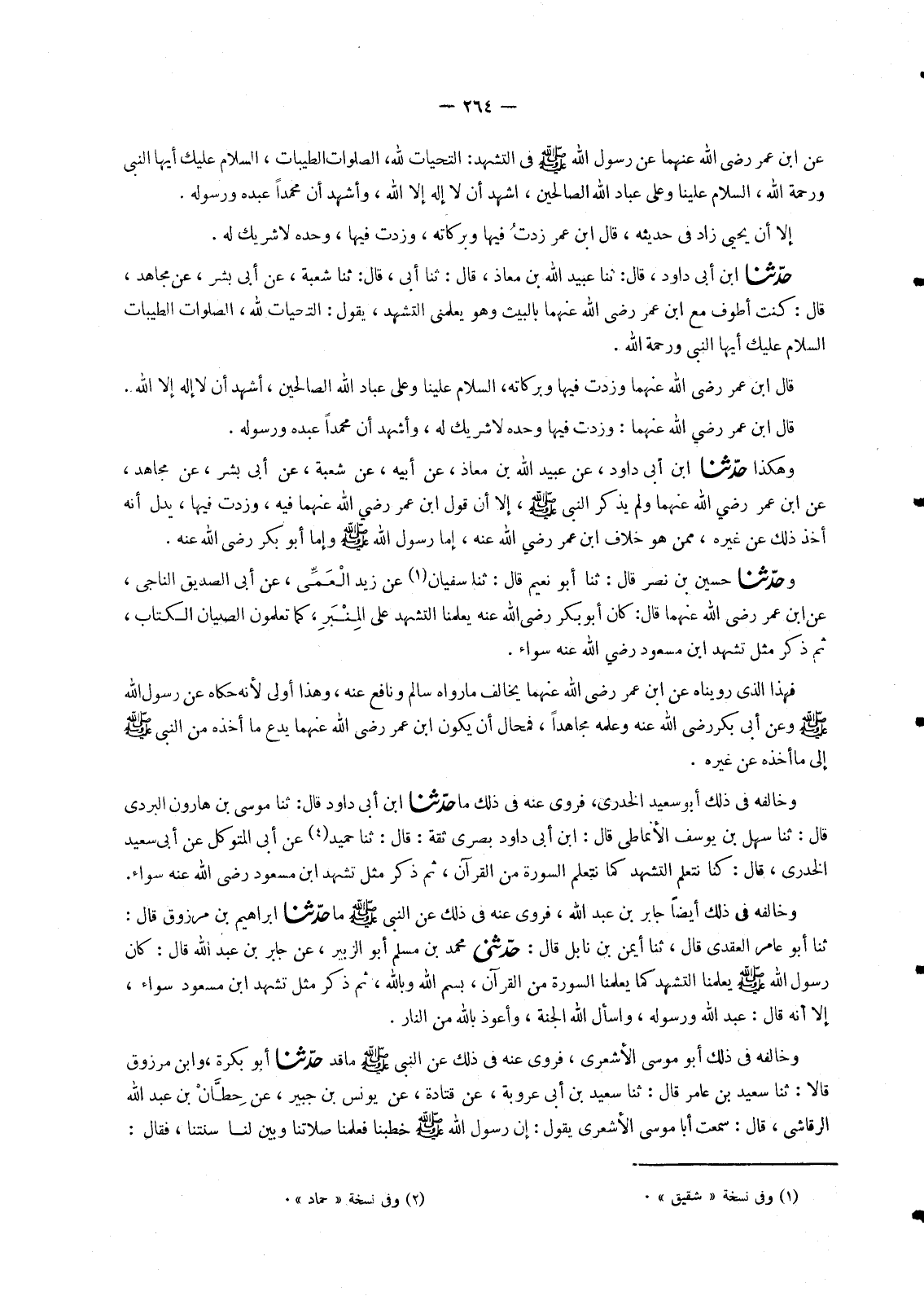 1574 - مَا حَدَّثَنَا ابْنُ أَبِي دَاوُدَ قَالَ: ثنا مُوسَى بْنُ هَارُونَ الْبُرْدِيُّ قَالَ: ثنا سَهْلُ بْنُ يُوسُفَ الْأَنْمَاطِيُّ قَالَ ابْنُ أَبِي دَاوُدَ بَصْرِيٌّ ثِقَةٌ قَالَ: ثنا حُمَيْدٌ عَنْ أَبِي الْمُتَوَكِّلِ عَنْ أَبِي سَعِيدٍ الْخُدْرِيِّ , قَالَ: «§كُنَّا نَتَعَلَّمُ التَّشَهُّدَ كَمَا نَتَعَلَّمُ السُّورَةَ مِنَ الْقُرْآنِ» ثُمَّ ذَكَرَ مِثْلَ تَشَهُّدِ ابْنِ مَسْعُودٍ رَضِيَ اللهُ عَنْهُ سَوَاءً. وَخَالَفَهُ فِي ذَلِكَ أَيْضًا جَابِرُ بْنُ عَبْدِ اللهِ , فَرُوِيَ عَنْهُ فِي ذَلِكَ عَنِ النَّبِيِّ صَلَّى اللَّهُ عَلَيْهِ وَسَلَّمَ
