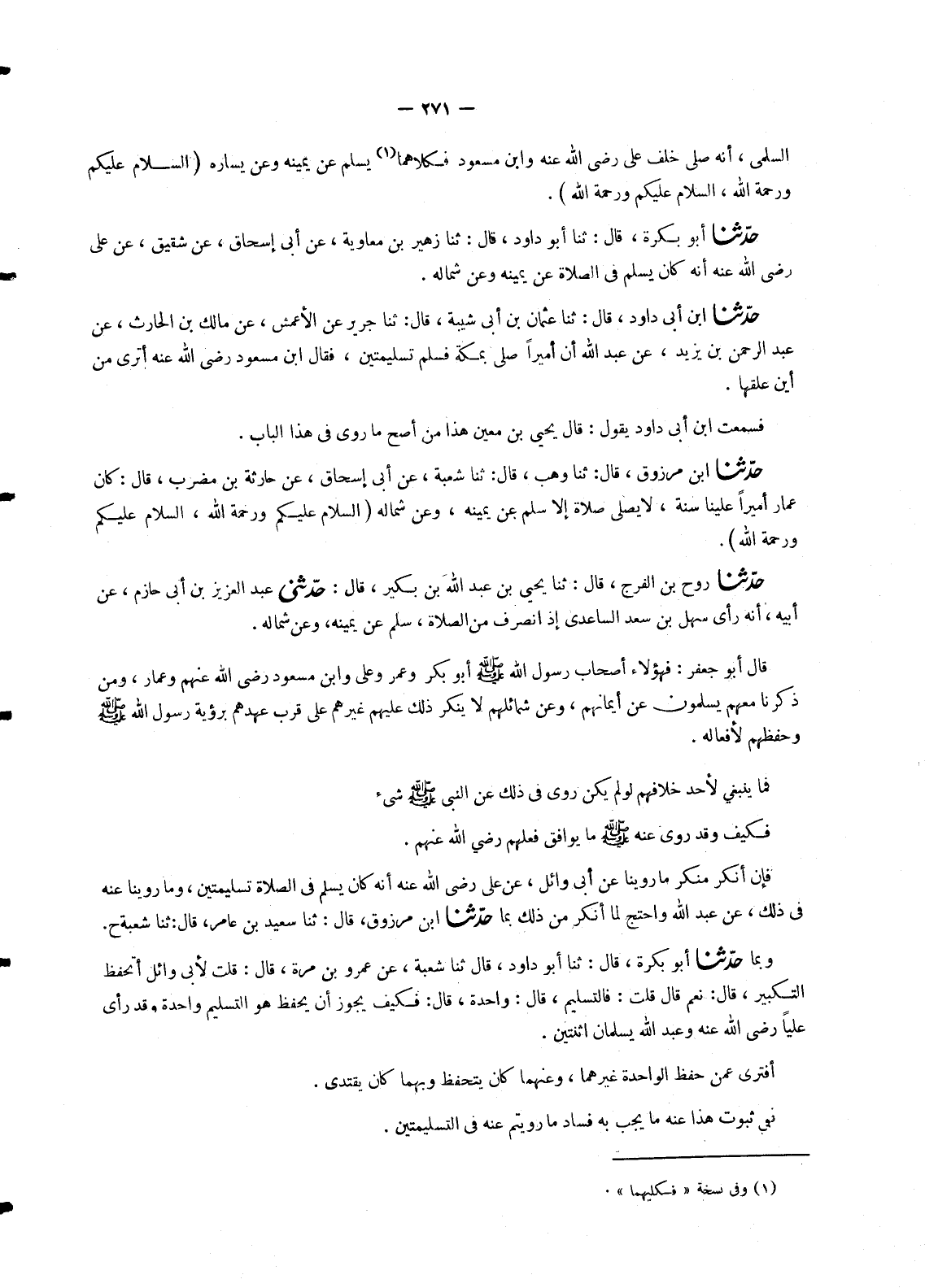 1624 - حَدَّثَنَا ابْنُ أَبِي دَاوُدَ، قَالَ: ثنا عُثْمَانُ بْنُ أَبِي شَيْبَةَ، قَالَ: ثنا جَرِيرٌ، عَنِ الْأَعْمَشِ، عَنْ مَالِكِ بْنِ الْحَارِثِ، عَنْ عَبْدِ الرَّحْمَنِ بْنِ يَزِيدَ، عَنْ عَبْدِ اللهِ، أَنَّ أَمِيرًا، صَلَّى بِمَكَّةَ §فَسَلَّمَ تَسْلِيمَتَيْنِ , فَقَالَ ابْنُ مَسْعُودٍ رَضِيَ اللهُ عَنْهُ: «أَتُرَى مِنْ أَيْنَ عَلِقَهَا» فَسَمِعْتُ ابْنَ أَبِي دَاوُدَ يَقُولُ: قَالَ يَحْيَى بْنُ مَعِينٍ: هَذَا مِنْ أَصَحِّ مَا رُوِيَ فِي هَذَا الْبَابِ