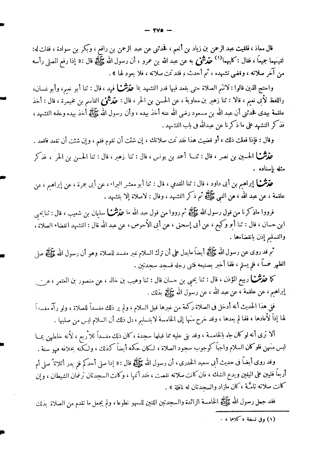 1645 -كَمَا حَدَّثَنَا رَبِيعٌ الْمُؤَذِّنُ , قَالَ: ثنا يَحْيَى بْنُ حَسَّانٍ قَالَ: ثنا وُهَيْبُ بْنُ خَالِدٍ عَنْ مَنْصُورِ بْنِ الْمُعْتَمِرِ , عَنْ إِبْرَاهِيمَ , عَنْ عَلْقَمَةَ , عَنْ عَبْدِ اللهِ , عَنْ رَسُولِ اللهِ صَلَّى اللَّهُ عَلَيْهِ وَسَلَّمَ بِذَلِكَ. فَفِي هَذَا الْحَدِيثِ أَنَّهُ أَدْخَلَ فِي الصَّلَاةِ رَكْعَةً مِنْ غَيْرِهَا قَبْلَ السَّلَامِ , وَلَمْ يَرَ ذَلِكَ مُفْسِدًا لِلصَّلَاةِ , وَلَوْ رَآهُ مُفْسِدًا لَهَا إِذًا لَأَعَادَهَا فَلَمَّا لَمْ يُعِدْهَا , وَقَدْ خَرَجَ مِنْهَا إِلَى الْخَامِسَةِ لَا بِتَسْلِيمٍ , دَلَّ ذَلِكَ أَنَّ السَّلَامَ لَيْسَ مِنْ صُلْبِهَا. أَلَا تَرَى أَنَّهُ لَوْ كَانَ جَاءَ بِالْخَامِسَةِ , وَقَدْ بَقِيَ عَلَيْهِ مِمَّا قَبْلَهَا سَجْدَةٌ , كَانَ ذَلِكَ مُفْسِدًا لِلْأَرْبَعِ , لِأَنَّهُ خَلَطَهُنَّ بِمَا لَيْسَ مِنْهُنَّ فَلَوْ كَانَ السَّلَامُ وَاجِبًا كَوُجُوبِ سُجُودِ الصَّلَاةِ , لَكَانَ حُكْمُهُ أَيْضًا كَذَلِكَ , وَلَكِنَّهُ بِخِلَافِهِ فَهُوَ سُنَّةٌ. وَقَدْ رُوِيَ أَيْضًا فِي حَدِيثِ أَبِي سَعِيدٍ الْخُدْرِيِّ , أَنَّ رَسُولَ اللهِ صَلَّى اللَّهُ عَلَيْهِ وَسَلَّمَ قَالَ: «إِذَا صَلَّى أَحَدُكُمْ فَلَمْ يَدْرِ أَثَلَاثًا صَلَّى أَمْ أَرْبَعًا فَلْيَبْنِ عَلَى الْيَقِينِ وَيَدَعِ الشَّكَّ , فَإِنْ كَانَتْ صَلَاتُهُ نَقَصَتْ , فَقَدْ أَتَمَّهَا , وَكَانَتِ السَّجْدَتَانِ تُرْغِمَانِ الشَّيْطَانَ , وَإِنْ كَانَتْ صَلَاتُهُ تَامَّةً , كَانَ مَا زَادَ وَالسَّجْدَتَانِ لَهُ نَافِلَةً» . فَقَدْ جَعَلَ رَسُولُ اللهِ صَلَّى اللَّهُ عَلَيْهِ وَسَلَّمَ الْخَامِسَةَ الزَّائِدَةَ وَالسَّجْدَتَيْنِ اللَّتَيْنِ لِلسَّهْوِ تَطَوُّعًا , وَلَمْ يَجْعَلْ مَا تَقَدَّمَ مِنَ الصَّلَاةِ بِذَلِكَ -[276]- فَاسِدًا وَإِنْ كَانَ الْمُصَلِّي قَدْ خَرَجَ مِنْهَا إِلَيْهِ , فَثَبَتَ بِذَلِكَ أَنَّ الصَّلَاةَ تَتِمُّ بِغَيْرِ تَسْلِيمٍ وَأَنَّ التَّسْلِيمَ مِنْ سُنَنِهَا لَا مِنْ صُلْبِهَا. فَكَانَ تَصْحِيحُ مَعَانِي الْآثَارِ فِي هَذَا الْبَابِ يُوجِبُ مَا ذَهَبَ إِلَيْهِ الَّذِينَ قَالُوا: لَا تَتِمُّ الصَّلَاةُ حَتَّى يَقْعُدَ مِقْدَارَ التَّشَهُّدِ لِأَنَّ حَدِيثَ عَلِيٍّ رَضِيَ اللهُ عَنْهُ , عَنِ النَّبِيِّ صَلَّى اللَّهُ عَلَيْهِ وَسَلَّمَ قَدِ احْتَمَلَ مَا ذَكَرْنَا وَاخْتُلِفَ فِي حَدِيثِ عَبْدِ اللهِ بْنِ عَمْرٍو , عَنِ النَّبِيِّ صَلَّى اللَّهُ عَلَيْهِ وَسَلَّمَ عَلَى مَا وَصَفْنَا وَأَمَّا حَدِيثُ ابْنِ مَسْعُودٍ فَهُوَ الَّذِي لَمْ يُخْتَلَفْ فِيهِ. وَأَمَّا وَجْهُ ذَلِكَ مِنْ طَرِيقِ النَّظَرِ , فَإِنَّ الَّذِينَ قَالُوا: إِنَّهُ إِذَا رَفَعَ رَأْسَهُ مِنْ آخِرِ سَجْدَةٍ مِنْ صَلَاتِهِ , فَقَدْ تَمَّتْ صَلَاتُهُ. قَالُوا: رَأَيْنَا هَذَا الْقُعُودَ قُعُودَ التَّشَهُّدِ وَفِيهِ ذِكْرٌ يُتَشَهَّدُ بِهِ وَتَسْلِيمٌ يُخْرَجُ بِهِ مِنَ الصَّلَاةِ , وَقَدْ رَأَيْنَا قَبْلَهُ فِي الصَّلَاةِ قُعُودًا فِيهِ ذِكْرٌ يُتَشَهَّدُ بِهِ. فَكُلٌّ قَدْ أَجْمَعَ أَنَّ ذَلِكَ الْقُعُودَ الْأَوَّلَ , وَمَا فِيهِ مِنَ الذِّكْرِ , لَيْسَ هُوَ مِنْ صُلْبِ الصَّلَاةِ , بَلْ هُوَ مِنْ سُنَنِهَا. وَاخْتُلِفَ فِي الْقُعُودِ الْأَخِيرِ فَالنَّظَرُ عَلَى مَا ذَكَرْنَا أَنْ يَكُونَ كَالْقُعُودِ الْأَوَّلِ , وَيَكُونُ مَا فِيهِ كَمَا فِي الْقُعُودِ الْأَوَّلِ , فَيَكُونُ سُنَّةً , وَكُلُّ مَا يُفْعَلُ فِيهِ سُنَّةٌ كَمَا كَانَ الْقُعُودُ الْأَوَّلُ سُنَّةً , وَكُلُّ مَا يُفْعَلُ فِيهِ سُنَّةٌ , وَقَدْ رَأَيْنَا الْقِيَامَ الَّذِي فِي كُلِّ الصَّلَاةِ وَالرُّكُوعَ وَالسُّجُودَ الَّذِي فِيهَا أَيْضًا كُلَّهُ كَذَلِكَ فَالنَّظَرُ عَلَى مَا ذَكَرْنَا أَنْ يَكُونَ الْقُعُو