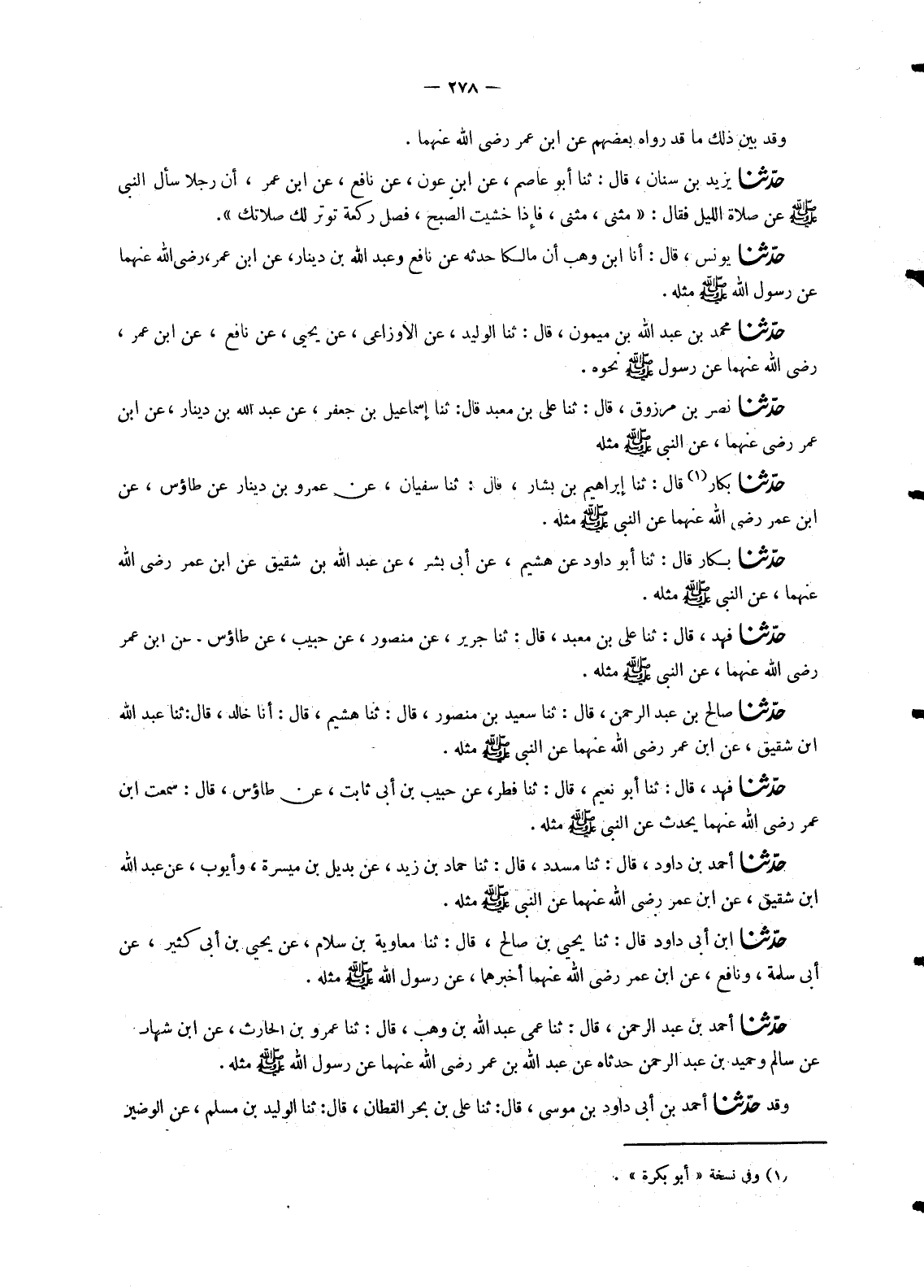 1657 -حَدَّثَنَا بَكَّارٌ، قَالَ: ثنا أَبُو دَاوُدَ، عَنْ هُشَيْمٍ، عَنْ أَبِي بِشْرٍ، عَنْ عَبْدِ اللهِ بْنِ شَقِيقٍ، عَنِ ابْنِ عُمَرَ، رَضِيَ اللهُ عَنْهُمَا , عَنِ النَّبِيِّ صَلَّى اللَّهُ عَلَيْهِ وَسَلَّمَ مِثْلَهُ