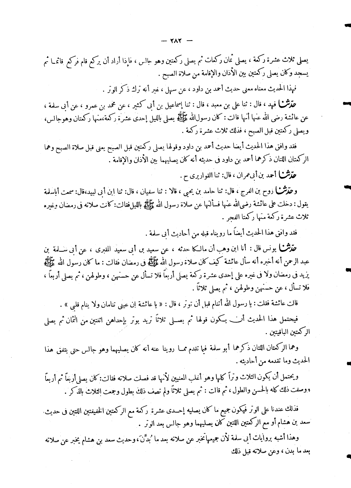 1681 - حَدَّثَنَا يُونُسُ، قَالَ: أنا ابْنُ وَهْبٍ، أَنَّ مَالِكًا، حَدَّثَهُ , عَنْ سَعِيدِ بْنِ أَبِي سَعِيدٍ الْمَقْبُرِيِّ، عَنْ أَبِي سَلَمَةَ بْنِ عَبْدِ الرَّحْمَنِ، أَنَّهُ أَخْبَرَهُ أَنَّهُ سَأَلَ عَائِشَةَ كَيْفَ كَانَ صَلَاةُ رَسُولِ اللهِ صَلَّى اللَّهُ عَلَيْهِ وَسَلَّمَ فِي رَمَضَانَ فَقَالَتْ: §مَا كَانَ رَسُولُ اللهِ صَلَّى اللَّهُ عَلَيْهِ وَسَلَّمَ يَزِيدُ فِي رَمَضَانَ وَلَا فِي غَيْرِهِ عَلَى إِحْدَى عَشْرَةَ رَكْعَةً يُصَلِّي أَرْبَعًا فَلَا تَسْأَلْ عَنْ حُسْنِهِنَّ , وَطُولِهِنَّ , ثُمَّ يُصَلِّي أَرْبَعًا , فَلَا تَسْأَلْ , عَنْ حُسْنِهِنَّ وَطُولِهِنَّ , ثُمَّ يُصَلِّي ثَلَاثًا قَالَتْ عَائِشَةُ فَقُلْتُ: يَا رَسُولَ اللهِ أَتَنَامُ قَبْلَ أَنْ تُوتِرَ , قَالَ: «يَا عَائِشَةُ إِنَّ عَيْنَيَّ تَنَامَانِ وَلَا يَنَامُ قَلْبِي» فَيَحْتَمِلُ هَذَا الْحَدِيثُ أَنْ يَكُونَ قَوْلُهَا ثُمَّ يُصَلِّي ثَلَاثًا تُرِيدُ يُوتِرُ بِإِحْدَاهُنَّ اثْنَتَيْنِ مِنَ الثَّمَانِ ثُمَّ يُصَلِّي الرَّكْعَتَيْنِ الْبَاقِيَتَيْنِ. وَهُمَا الرَّكْعَتَانِ اللَّتَانِ ذَكَرَهُمَا أَبُو سَلَمَةَ فِيمَا تَقَدَّمَ مِمَّا رَوَيْنَا عَنْهُ أَنَّهُ كَانَ يُصَلِّيهِمَا وَهُوَ جَالِسٌ حَتَّى يَتَّفِقَ هَذَا الْحَدِيثُ وَمَا تَقَدَّمَهُ مِنْ أَحَادِيثِهِ. وَيَحْتَمِلُ أَنْ يَكُونَ الثَّلَاثُ وِتْرًا كُلُّهَا وَهُوَ أَغْلَبُ الْمَعْنَيَيْنِ ; لِأَنَّهَا قَدْ فَصَّلَتْ صَلَاتَهُ فَقَالَتْ: كَانَ يُصَلِّي أَرْبَعًا ثُمَّ أَرْبَعًا وَوَصَفَتْ ذَلِكَ كُلَّهُ بِالْحُسْنِ وَالطُّولِ , ثُمَّ قَالَتْ: ثُمَّ يُصَلِّي ثَلَاثًا وَلَمْ تَصِفْ ذَلِكَ بِطُولٍ وَجَمَعَتِ الثَّلَاثَ بِالذِّكْرِ. فَذَلِكَ عِنْدَنَا عَلَى الْوِتْرِ فَيَكُونُ جَمِيعُ مَا كَانَ يُصَلِّيهِ إِحْدَى عَشْرَةَ رَكْعَةً مَعَ الرَّكْعَتَيْنِ الْخَفِيفَتَيْنِ اللَّتَيْنِ فِي حَدِيثِ سَعْدِ بْنِ هِشَامٍ أَوْ مَعَ الرَّكْعَتَيْنِ اللَّتَيْنِ كَانَ يُصَلِّيهِمَا وَهُوَ جَالِسٌ بَعْدَ الْوِتْرِ. وَهَذَا أَشْبَهُ بِرِوَايَاتِ أَبِي سَلَمَةَ لِأَنَّ جَمِيعَهَا تُخْبِرُ عَنْ صَلَاتِهِ بَعْدَمَا بَدَّنَ , وَحَدِيثُ سَعْدِ بْنِ هِشَامٍ يُخْبِرُ عَنْ صَلَاتِهِ بَعْدَمَا بَدَّنَ , وَعَنْ صَلَاتِهِ قَبْلَ ذَلِكَ -[283]- وَقَدْ رَوَى عُرْوَةُ بْنُ الزُّبَيْرِ , عَنْ عَائِشَةَ رَضِيَ اللهُ عَنْهَا فِي ذَلِكَ