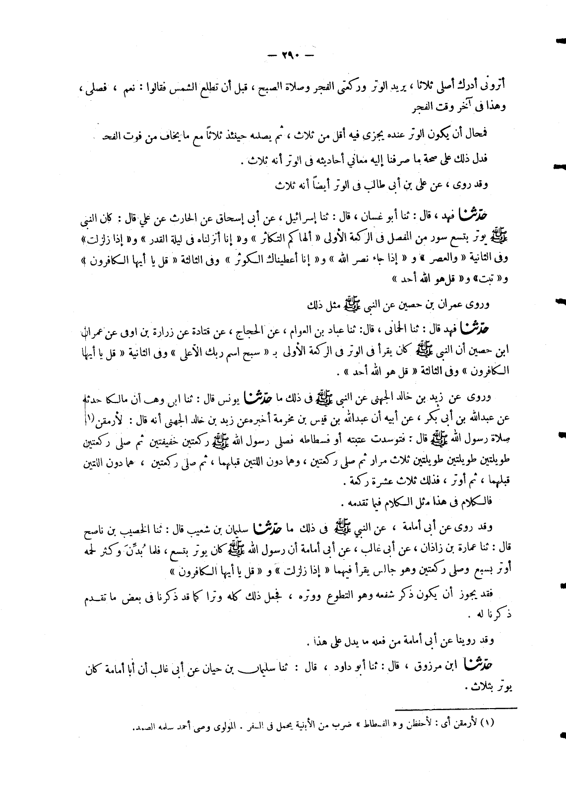 1724 - حَدَّثَنَا فَهْدٌ , قَالَ: ثنا أَبُو غَسَّانَ , قَالَ: ثنا إِسْرَائِيلُ , عَنْ أَبِي إِسْحَاقَ عَنِ الْحَارِثِ عَنْ عَلِيٍّ قَالَ: «كَانَ النَّبِيُّ صَلَّى اللَّهُ عَلَيْهِ وَسَلَّمَ §يُوتِرُ بِتِسْعِ سُوَرٍ مِنَ الْمُفَصَّلِ فِي الرَّكْعَةِ الْأُولَى أَلْهَاكُمُ التَّكَاثُرُ وَإِنَّا أَنْزَلْنَاهُ فِي لَيْلَةِ الْقَدْرِ وَإِذَا زُلْزِلَتْ وَفِي الثَّانِيَةِ وَالْعَصْرِ وَإِذَا جَاءَ نَصْرُ اللهِ وَإِنَّا أَعْطَيْنَاكَ الْكَوْثَرَ وَفِي الثَّالِثَةِ قُلْ يَا أَيُّهَا الْكَافِرُونَ وَتَبَّتْ وَقُلْ هُوَ اللهُ أَحَدٌ» وَرَوَى عِمْرَانُ بْنُ حُصَيْنٍ عَنِ النَّبِيِّ صَلَّى اللَّهُ عَلَيْهِ وَسَلَّمَ مِثْلَ ذَلِكَ
