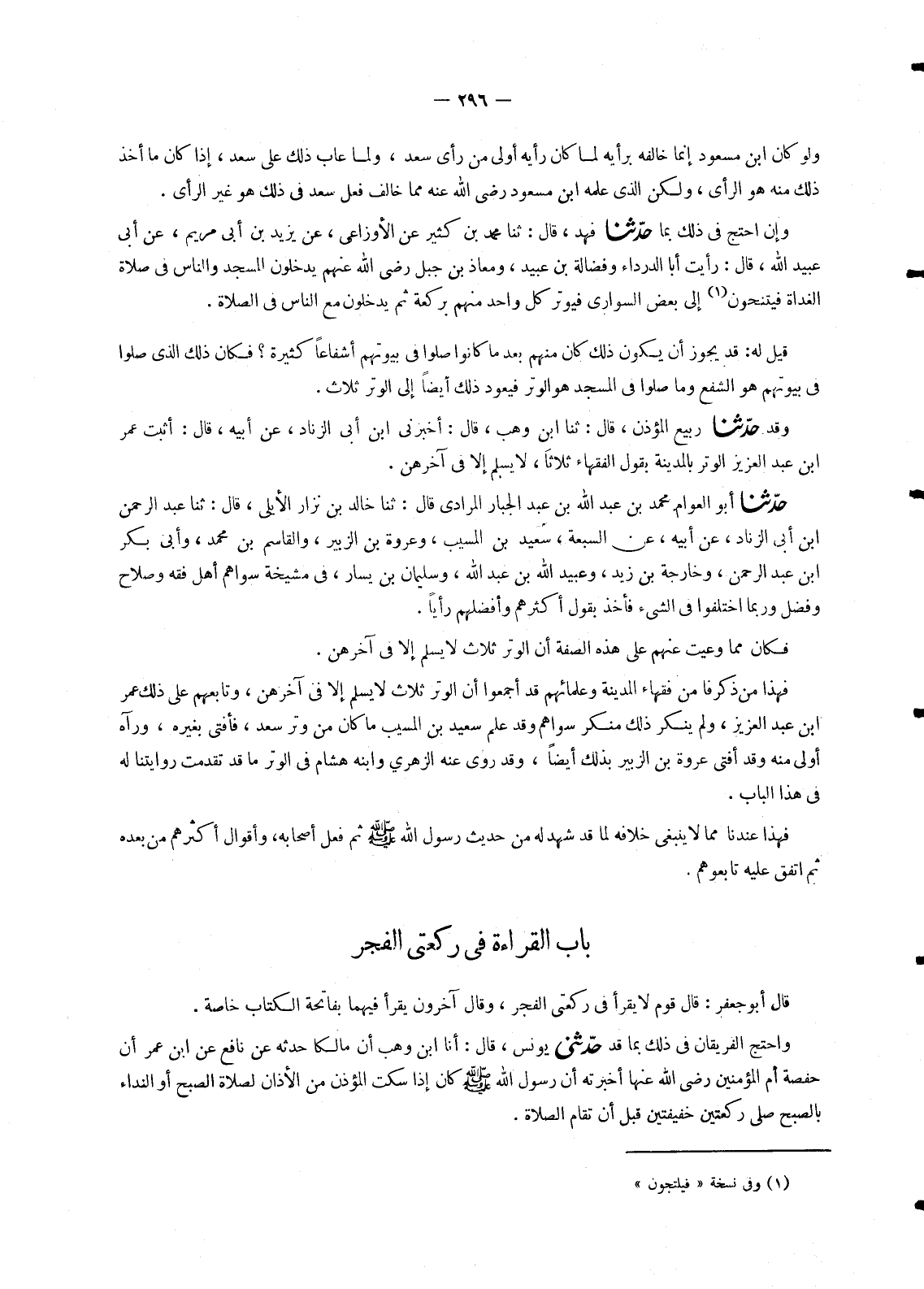 1758 - حَدَّثَنَا أَبُو الْعَوَّامِ مُحَمَّدُ بْنُ عَبْدِ اللهِ بْنِ عَبْدِ الْجَبَّارِ الْمُرَادِيُّ قَالَ: ثنا خَالِدُ بْنُ نِزَارٍ الْأَيْلِيُّ، قَالَ: ثنا عَبْدُ الرَّحْمَنِ بْنُ أَبِي الزِّنَادِ، عَنْ أَبِيهِ، عَنِ السَّبْعَةِ، سَعِيدِ بْنِ الْمُسَيِّبِ , وَعُرْوَةَ بْنِ الزُّبَيْرِ , وَالْقَاسِمِ بْنِ مُحَمَّدٍ , وَأَبِي بَكْرِ بْنِ عَبْدِ الرَّحْمَنِ , وَخَارِجَةَ بْنِ زَيْدٍ , وَعُبَيْدِ اللهِ بْنِ عَبْدِ اللهِ , وَسُلَيْمَانَ بْنِ يَسَارٍ , فِي مَشْيَخَةٍ سِوَاهُمْ أَهْلِ فِقْهٍ وَصَلَاحٍ وَفَضْلٍ وَرُبَّمَا اخْتَلَفُوا فِي الشَّيْءِ فَأَخَذَ بِقَوْلِ أَكْثَرِهِمْ وَأَفْضَلِهِمْ رَأْيًا. فَكَانَ مِمَّا وَعَيْتُ عَنْهُمْ عَلَى هَذِهِ الصِّفَةِ: «أَنَّ §الْوِتْرَ ثَلَاثٌ لَا يُسَلِّمُ إِلَّا فِي آخِرِهِنَّ» فَهَذَا مَنْ ذَكَرْنَا مِنْ فُقَهَاءِ الْمَدِينَةِ وَعُلَمَائِهِمْ قَدْ أَجْمَعُوا أَنَّ الْوِتْرَ ثَلَاثٌ لَا يُسَلِّمُ إِلَّا فِي آخِرِهِنَّ , وَتَابَعَهُمْ عَلَى ذَلِكَ عُمَرُ بْنُ عَبْدِ الْعَزِيزِ , وَلَمْ يُنْكِرْ ذَلِكَ مُنْكِرٌ سِوَاهُمْ وَقَدْ عَلِمَ سَعِيدُ بْنُ الْمُسَيِّبِ مَا كَانَ مِنْ وِتْرِ سَعْدٍ , فَأَفْتَى بِغَيْرِهِ , وَرَآهُ أَوْلَى مِنْهُ وَقَدْ أَفْتَى عُرْوَةُ بْنُ الزُّبَيْرِ بِذَلِكَ أَيْضًا , وَقَدْ رَوَى عَنْهُ الزُّهْرِيُّ وَابْنُهُ هِشَامٌ فِي الْوِتْرِ مَا قَدْ تَقَدَّمَتْ رِوَايَتُنَا لَهُ فِي هَذَا الْبَابِ. فَهَذَا عِنْدَنَا مِمَّا لَا يَنْبَغِي خِلَافُهُ لِمَا قَدْ شَهِدَ لَهُ مِنْ حَدِيثِ رَسُولِ اللهِ صَلَّى اللَّهُ عَلَيْهِ وَسَلَّمَ ثُمَّ فِعْلِ أَصْحَابِهِ , وَأَقْوَالِ أَكْثَرِهِمْ مِنْ بَعْدِهِ ثُمَّ اتَّفَقَ عَلَيْهِ تَابِعُوهُمْ