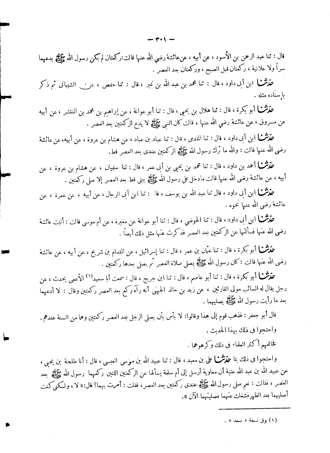 1798 - حَدَّثَنَا ابْنُ أَبِي دَاوُدَ، قَالَ: ثنا الْمُقَدَّمِيُّ، قَالَ: ثنا عَبَّادُ بْنُ عَبَّادٍ، عَنْ هِشَامِ بْنِ عُرْوَةَ، عَنْ أَبِيهِ، عَنْ عَائِشَةَ، رَضِيَ اللهُ عَنْهَا قَالَتْ: «وَاللهِ §مَا تَرَكَ رَسُولُ اللهِ صَلَّى اللَّهُ عَلَيْهِ وَسَلَّمَ الرَّكْعَتَيْنِ عِنْدِي بَعْدَ الْعَصْرِ قَطُّ»