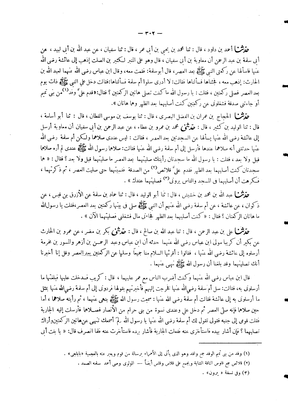 1808 - حَدَّثَنَا عَلِيُّ بْنُ عَبْدِ الرَّحْمَنِ، قَالَ: ثنا عَبْدُ اللهِ بْنُ صَالِحٍ، قَالَ: حَدَّثَنِي بَكْرُ بْنُ مُضَرَ، عَنْ عَمْرِو بْنِ الْحَارِثِ، عَنْ بُكَيْرٍ، أَنَّ كُرَيْبًا، مَوْلَى ابْنِ عَبَّاسٍ رَضِيَ اللهُ عَنْهُمَا حَدَّثَهُ: أَنَّ ابْنَ عَبَّاسٍ وَعَبْدَ الرَّحْمَنِ بْنَ أَزْهَرَ وَالْمِسْوَرَ بْنَ مَخْرَمَةَ أَرْسَلُوهُ إِلَى عَائِشَةَ رَضِيَ اللهُ عَنْهَا , فَقَالُوا: أَقْرِئْهَا السَّلَامَ مِنَّا جَمِيعًا وَسَلْهَا عَنِ الرَّكْعَتَيْنِ بَعْدَ الْعَصْرِ وَقُلْ إِنَّا أُخْبِرْنَا أَنَّكِ تُصَلِّينَهُمَا وَقَدْ بَلَغَنَا أَنَّ رَسُولَ اللهِ صَلَّى اللَّهُ عَلَيْهِ وَسَلَّمَ نَهَى عَنْهُمَا. قَالَ ابْنُ عَبَّاسِ رَضِيَ اللهُ عَنْهُمَا: وَكُنْتُ أَضْرِبُ النَّاسَ مَعَ عُمَرَ عَلَيْهِمَا , قَالَ كُرَيْبٌ فَدَخَلْتُ عَلَيْهَا فَبَلَّغْتُهَا مَا أَرْسَلُونِي بِهِ , فَقَالَتْ: سَلْ أُمَّ سَلَمَةَ رَضِيَ اللهُ عَنْهَا فَخَرَجْتُ إِلَيْهِمْ فَأَخْبَرْتُهُمْ بِقَوْلِهَا فَرَدُّونِي إِلَى أُمِّ سَلَمَةَ رَضِيَ اللهُ عَنْهَا بِمِثْلِ مَا أَرْسَلُونِي بِهِ إِلَى عَائِشَةَ فَقَالَتْ أُمُّ سَلَمَةِ رَضِيَ اللهُ عَنْهَا: " سَمِعْتُ رَسُولَ اللهِ صَلَّى اللَّهُ عَلَيْهِ وَسَلَّمَ يَنْهَى عَنْهُمَا , ثُمَّ رَأَيْتُهُ صَلَّاهُمَا , أَمَّا حِينَ صَلَّاهُمَا فَإِنَّهُ صَلَّى الْعَصْرَ ثُمَّ دَخَلَ عَلَيَّ وَعِنْدِي نِسْوَةٌ مِنْ بَنِي حَرَامٍ مِنَ الْأَنْصَارِ فَصَلَّاهُمَا فَأَرْسَلْتُ إِلَيْهِ الْجَارِيَةَ فَقُلْتُ: قُومِي إِلَى جَنْبِهِ فَقُولِي تَقُولُ لَكَ أُمُّ سَلَمَةَ رَضِيَ اللهُ عَنْهَا: يَا رَسُولَ اللهِ لِمَ أَسْمَعُكَ تَنْهَى عَنْ هَاتَيْنِ الرَّكْعَتَيْنِ وَأَرَاكَ تُصَلِّيهِمَا؟ فَإِنْ أَشَارَ بِيَدِهِ فَاسْتَأْخِرِي عَنْهُ فَفَعَلَتِ الْجَارِيَةُ فَأَشَارَ بِيَدِهِ فَاسْتَأْخَرَتْ عَنْهُ فَلَمَّا انْصَرَفَ قَالَ: «يَا بِنْتَ أَبِي أُمَيَّةَ §-[303]- سَأَلْتِ عَنِ الرَّكْعَتَيْنِ بَعْدَ الْعَصْرِ , وَإِنَّهُ أَتَانِي أُنَاسٌ مِنْ عَبْدِ الْقَيْسِ بِالْإِسْلَامِ مِنْ قَوْمٍ فَشَغَلُونِي عَنِ الرَّكْعَتَيْنِ اللَّتَيْنِ بَعْدَ الظُّهْرِ فَهُمَا هَاتَانِ» فَفِي هَذِهِ الْآثَارِ أَوْ فِي بَعْضِهَا أَنَّ عَائِشَةَ رَضِيَ اللهُ عَنْهَا لَمَّا سُئِلَتْ عَمَّا حُكِيَ عَنْهَا مِمَّا ذَكَرْنَا فِي الْفَصْلِ الْأَوَّلِ أَنَّ النَّبِيَّ صَلَّى اللَّهُ عَلَيْهِ وَسَلَّمَ لَمْ يَكُنْ يَأْتِيهَا فِي بَيْتِهَا بَعْدَ الْعَصْرِ إِلَّا صَلَّى رَكْعَتَيْنِ أَضَافَتْ ذَلِكَ إِلَى أُمِّ سَلَمَةَ رَضِيَ اللهُ عَنْهَا فَانْتَفَتْ بِذَلِكَ الْآثَارُ الْأُوَلُ كُلُّهَا الْمَرْوِيَّةُ عَنْ عَائِشَةَ رَضِيَ اللهُ عَنْهَا فَلَمَّا سُئِلَتْ عَنْ ذَلِكَ أُمُّ سَلَمَةَ رَضِيَ اللهُ عَنْهَا أَخْبَرَتْ أَنَّهَا قَدْ كَانَتْ سَمِعَتِ النَّبِيَّ صَلَّى اللَّهُ عَلَيْهِ وَسَلَّمَ يَنْهَى عَنْهُمَا. وَوَافَقَهَا عَلَى ذَلِكَ ابْنُ عَبَّاسٍ رَضِيَ اللهُ عَنْهُ وَالْمِسْوَرُ بْنُ مَخْرَمَةَ , وَعَبْدُ الرَّحْمَنِ بْنُ الْأَزْهَرِ إِلَّا أَنَّهُمْ ذَكَرُوا ذَلِكَ بَلَاغًا وَلَمْ يَذْكُرُوهُ سَمَاعًا. وَوَافَقَهُمْ عَلَى ذَلِكَ جَمَاعَةٌ حَكَوْهُ عَنِ النَّبِيِّ صَلَّى اللَّهُ عَلَيْهِ وَسَلَّمَ فَمِمَّا رُوِيَ فِي ذَلِكَ