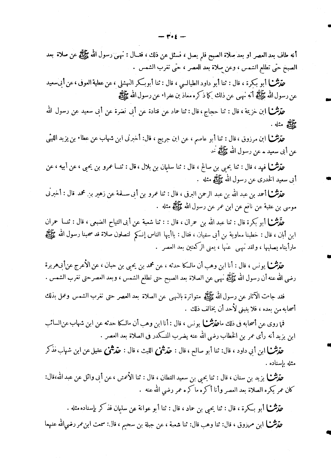 1824 - حَدَّثَنَا يُونُسُ، قَالَ: أنا ابْنُ وَهْبٍ، أَنَّ مَالِكًا، حَدَّثَهُ , عَنْ مُحَمَّدِ بْنِ يَحْيَى بْنِ حَبَّانَ، عَنِ الْأَعْرَجِ، عَنْ أَبِي هُرَيْرَةَ، رَضِيَ اللهُ عَنْهُ «أَنَّ رَسُولَ اللهِ صَلَّى اللَّهُ عَلَيْهِ وَسَلَّمَ §نَهَى عَنِ الصَّلَاةِ بَعْدَ الصُّبْحِ حَتَّى تَطْلُعَ الشَّمْسُ , وَبَعْدَ الْعَصْرِ حَتَّى تَغْرُبَ الشَّمْسُ» فَقَدْ جَاءَتِ الْآثَارُ عَنْ رَسُولِ اللهِ صَلَّى اللَّهُ عَلَيْهِ وَسَلَّمَ مُتَوَاتِرَةً بِالنَّهْيِ عَنِ الصَّلَاةِ بَعْدَ الْعَصْرِ حَتَّى تَغْرُبَ الشَّمْسُ وَعَمِلَ بِذَلِكَ أَصْحَابُهُ مِنْ بَعْدِهِ , فَلَا يَنْبَغِي لِأَحَدٍ أَنْ يُخَالِفَ ذَلِكَ. فَمِمَّا رُوِيَ عَنْ أَصْحَابِهِ فِي ذَلِكَ