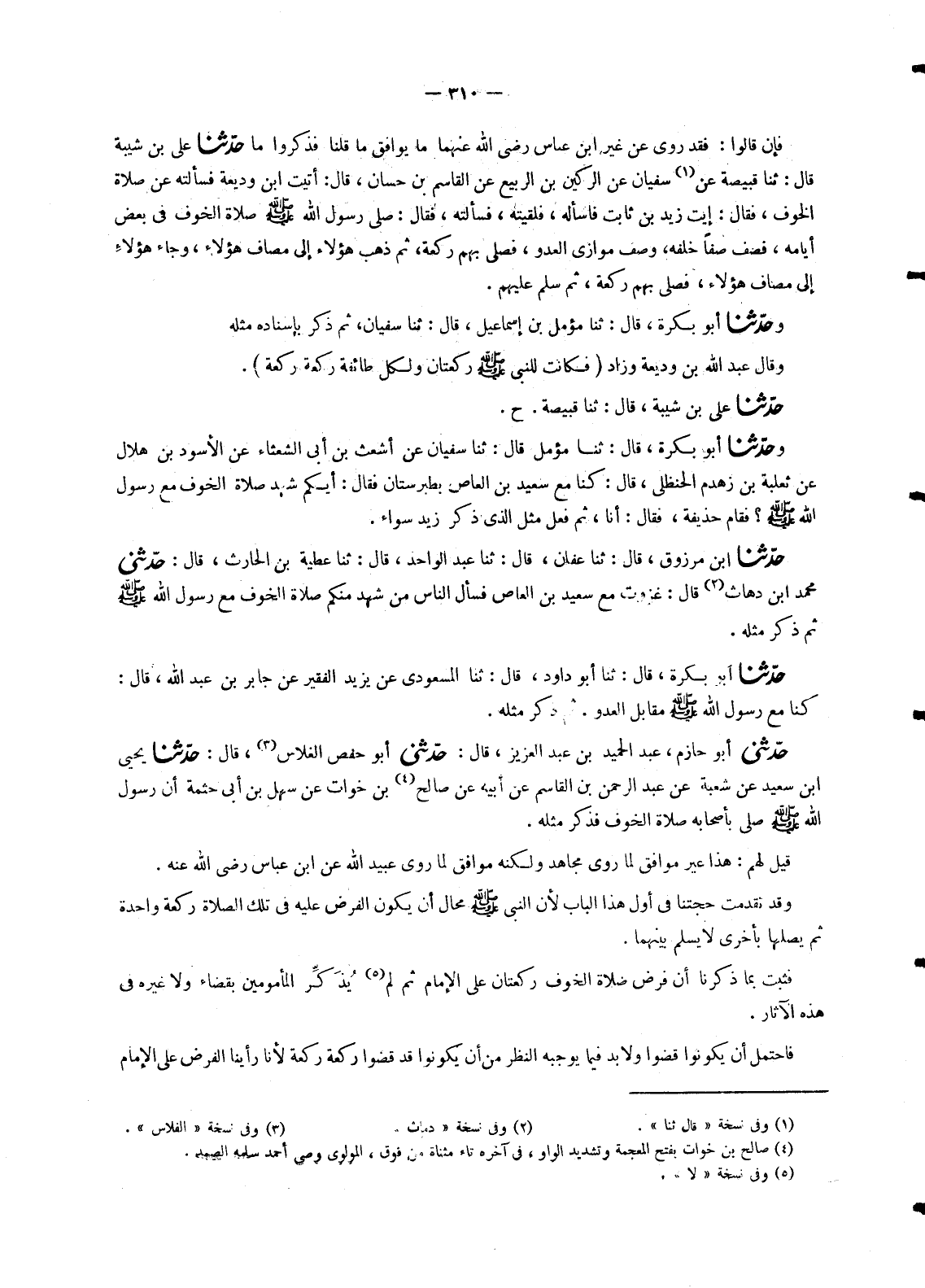 1852 - فَذَكَرُوا مَا حَدَّثَنَا عَلِيُّ بْنُ شَيْبَةَ قَالَ: ثنا قَبِيصَةُ عَنْ سُفْيَانَ عَنِ الرُّكَيْنِ بْنِ الرَّبِيعِ عَنِ الْقَاسِمِ بْنِ حَسَّانَ , قَالَ: " أَتَيْتُ ابْنَ وَدِيعَةَ فَسَأَلْتُهُ عَنْ صَلَاةِ الْخَوْفِ , فَقَالَ: ائْتِ زَيْدَ بْنَ ثَابِتٍ فَاسْأَلْهُ , فَلَقِيتُهُ , فَسَأَلْتُهُ , فَقَالَ: «§صَلَّى رَسُولُ اللهِ صَلَّى اللَّهُ عَلَيْهِ وَسَلَّمَ صَلَاةَ الْخَوْفِ فِي بَعْضِ أَيَّامِهِ , فَصَفَّ صَفًّا خَلْفَهُ , وَصَفًّا مُوَازِيَ الْعَدُوِّ , فَصَلَّى بِهِمْ رَكْعَةً , ثُمَّ ذَهَبَ هَؤُلَاءِ إِلَى مَصَافِّ هَؤُلَاءِ , وَجَاءَ هَؤُلَاءِ إِلَى مَصَافِّ هَؤُلَاءِ , فَصَلَّى بِهِمْ رَكْعَةً , ثُمَّ سَلَّمَ عَلَيْهِمْ»