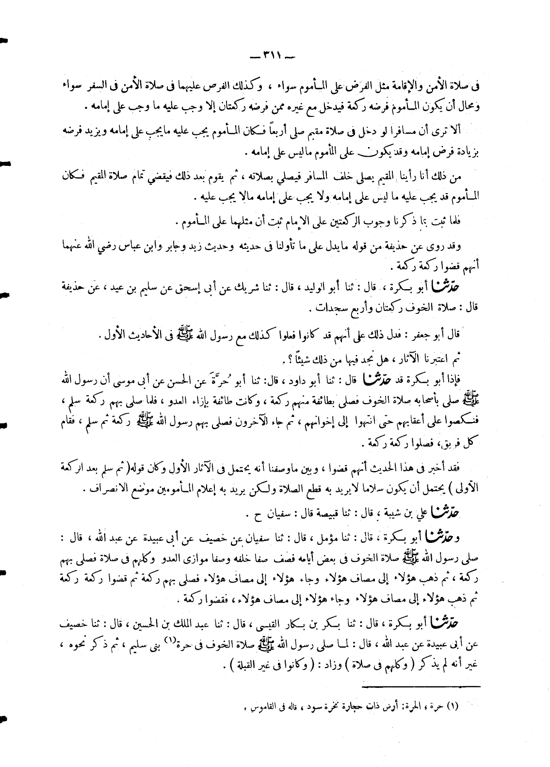 1860 - فَإِذَا أَبُو بَكْرَةَ قَدْ حَدَّثَنَا قَالَ: ثنا أَبُو دَاوُدَ , قَالَ: ثنا أَبُو حُرَّةَ عَنِ الْحَسَنِ عَنْ أَبِي مُوسَى «أَنَّ رَسُولَ اللهِ صَلَّى اللَّهُ عَلَيْهِ وَسَلَّمَ §صَلَّى بِأَصْحَابِهِ صَلَاةَ الْخَوْفِ فَصَلَّى بِطَائِفَةٍ مِنْهُمْ رَكْعَةً , وَكَانَتْ طَائِفَةٌ بِإِزَاءِ الْعَدُوِّ , فَلَمَّا صَلَّى بِهِمْ رَكْعَةً سَلَّمَ , فَنَكَصُوا عَلَى أَعْقَابِهِمْ حَتَّى انْتَهَوْا إِلَى إِخْوَانِهِمْ , ثُمَّ جَاءَ الْآخَرُونَ فَصَلَّى بِهِمْ رَسُولُ اللهِ صَلَّى اللَّهُ عَلَيْهِ وَسَلَّمَ رَكْعَةً ثُمَّ سَلَّمَ , فَقَامَ كُلُّ فَرِيقٍ , فَصَلَّوْا رَكْعَةً رَكْعَةً» فَقَدْ أَخْبَرَ فِي هَذَا الْحَدِيثِ أَنَّهُمْ قَضَوْا , وَبَيَّنَ مَا وَصَفْنَا أَنَّهُ يُحْتَمَلُ فِي الْآثَارِ الْأُوَلِ وَكَانَ قَوْلُهُ ثُمَّ سَلَّمَ بَعْدَ الرَّكْعَةِ الْأُولَى يُحْتَمَلُ أَنْ يَكُونَ سَلَامًا لَا يُرِيدُ بِهِ قَطْعَ الصَّلَاةِ وَلَكِنْ يُرِيدُ بِهِ إِعْلَامَ الْمَأْمُومِينَ مَوْضِعَ الِانْصِرَافِ