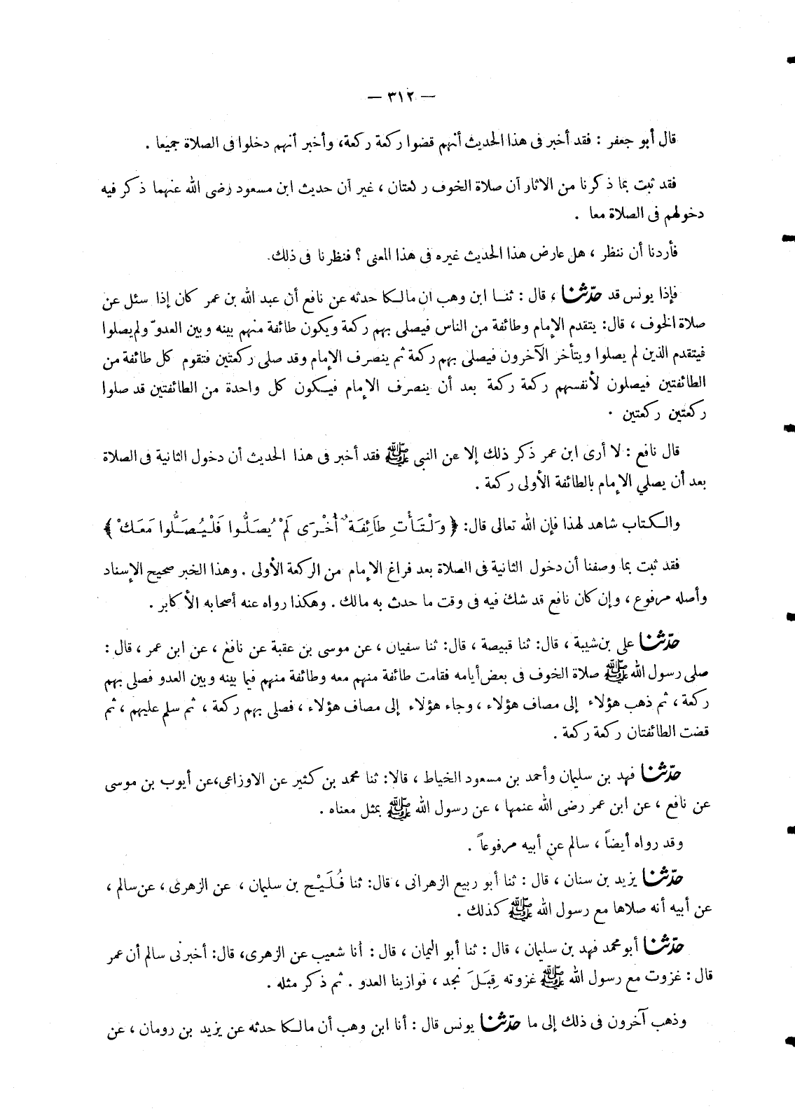 1864 - فَإِذَا يُونُسُ قَدْ حَدَّثَنَا , قَالَ: ثنا ابْنُ وَهْبٍ أَنَّ مَالِكًا حَدَّثَهُ عَنْ نَافِعٍ: أَنَّ عَبْدَ اللهِ بْنَ عُمَرَ كَانَ §إِذَا سُئِلَ عَنْ صَلَاةِ الْخَوْفِ , قَالَ: «يَتَقَدَّمُ الْإِمَامُ وَطَائِفَةٌ مِنَ النَّاسِ فَيُصَلِّي بِهِمْ رَكْعَةً , وَيَكُونُ طَائِفَةٌ مِنْهُمْ بَيْنَهُ وَبَيْنَ الْعَدُوِّ وَلَمْ يُصَلُّوا فَيَتَقَدَّمُ الَّذِينَ لَمْ يُصَلُّوا وَيَتَأَخَّرُ الْآخَرُونَ فَيُصَلِّي بِهِمْ رَكْعَةً ثُمَّ يَنْصَرِفُ الْإِمَامُ , وَقَدْ صَلَّى رَكْعَتَيْنِ فَتَقُومُ طَائِفَةٌ مِنَ الطَّائِفَتَيْنِ فَيُصَلُّونَ لِأَنْفُسِهِمْ رَكْعَةً رَكْعَةً بَعْدَ أَنْ يَنْصَرِفَ الْإِمَامُ فَيَكُونَ كُلُّ وَاحِدَةٍ مِنَ الطَّائِفَتَيْنِ قَدْ صَلَّوْا رَكْعَتَيْنِ رَكْعَتَيْنِ» قَالَ نَافِعٌ: لَا أَرَى ابْنَ عُمَرَ ذَكَرَ ذَلِكَ إِلَّا عَنِ النَّبِيِّ صَلَّى الله عَلَيْهِ فَقَدْ أَخْبَرَ فِي هَذَا الْحَدِيثِ أَنَّ دُخُولَ الثَّانِيَةِ فِي الصَّلَاةِ بَعْدَ أَنْ يُصَلِّيَ الْإِمَامُ بِالطَّائِفَةِ الْأُولَى رَكْعَةً. وَالْكِتَابُ شَاهِدٌ لِهَذَا فَإِنَّ اللهَ تَعَالَى قَالَ: {وَلْتَأْتِ طَائِفَةٌ أُخْرَى لَمْ يُصَلُّوا فَلْيُصَلُّوا مَعَكَ} [النساء: 102] فَقَدْ ثَبَتَ بِمَا وَصَفْنَا أَنَّ دُخُولَ الثَّانِيَةِ فِي الصَّلَاةِ بَعْدَ فَرَاغِ الْإِمَامِ مِنَ الرَّكْعَةِ الْأُولَى. وَهَذَا الْخَبَرُ صَحِيحُ الْإِسْنَادِ وَأَصْلُهُ مَرْفُوعٌ , وَإِنْ كَانَ نَافِعٌ قَدْ شَكَّ فِيهِ فِي وَقْتِ مَا حَدَّثَ بِهِ مَالِكٌ. وَهَكَذَا رَوَاهُ عَنْهُ أَصْحَابُهُ الْأَكَابِرُ