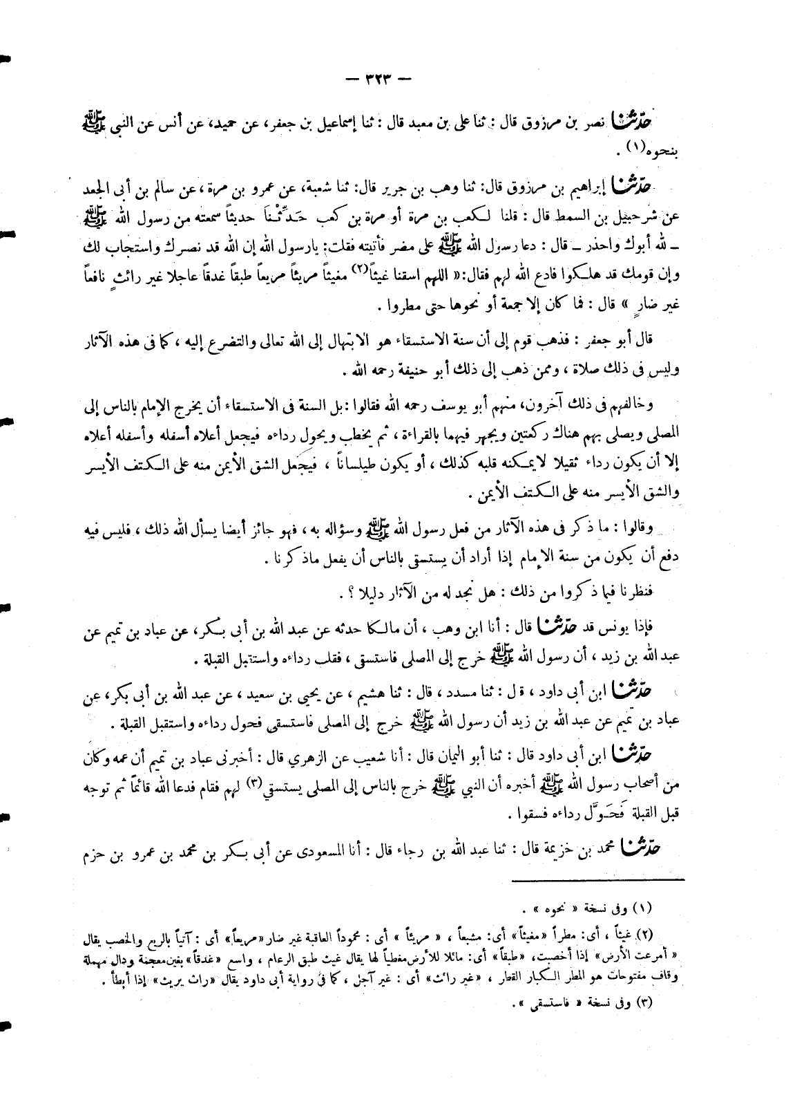 1896 - حَدَّثَنَا إِبْرَاهِيمُ بْنُ مَرْزُوقٍ، قَالَ: ثنا وَهْبُ بْنُ جَرِيرٍ، قَالَ: ثنا شُعْبَةُ، عَنْ عَمْرِو بْنِ مُرَّةَ، عَنْ سَالِمِ بْنِ أَبِي الْجَعْدِ، عَنْ شُرَحْبِيلَ بْنِ السِّمْطِ، قَالَ: قُلْنَا لِكَعْبِ بْنِ مُرَّةَ أَوْ مُرَّةَ بْنِ كَعْبٍ حَدَّثَنَا حَدِيثًا، سَمِعْتُهُ مِنْ رَسُولِ اللهِ صَلَّى اللَّهُ عَلَيْهِ وَسَلَّمَ، لِلَّهِ أَبُوكَ وَاحْذَرْ، قَالَ: دَعَا رَسُولُ اللهِ صَلَّى اللَّهُ عَلَيْهِ وَسَلَّمَ عَلَى مُضَرَ فَأَتَيْتُهُ فَقُلْتُ: يَا رَسُولَ اللهِ إِنَّ اللهَ قَدْ نَصَرَكَ وَاسْتَجَابَ لَكَ وَإِنَّ قَوْمَكَ قَدْ هَلَكُوا فَادْعُ اللهَ لَهُمْ فَقَالَ: «§اللهُمَّ اسْقِنَا غَيْثًا مُغِيثًا مَرِيئًا مُرِيعًا طَبَقًا غَدَقًا عَاجِلًا غَيْرَ رَائِثٍ نَافِعًا غَيْرَ ضَارٍّ» قَالَ: فَمَا كَانَ إِلَّا جُمُعَةٌ أَوْ نَحْوُهَا حَتَّى مُطِرُوا قَالَ أَبُو جَعْفَرٍ: فَذَهَبَ قَوْمٌ إِلَى أَنَّ سُنَّةَ الِاسْتِسْقَاءِ هُوَ الِابْتِهَالُ إِلَى اللهِ تَعَالَى وَالتَّضَرُّعُ إِلَيْهِ , كَمَا فِي هَذِهِ الْآثَارِ وَلَيْسَ فِي ذَلِكَ صَلَاةٌ , وَمِمَّنْ ذَهَبَ إِلَى ذَلِكَ أَبُو حَنِيفَةَ رَحِمَهُ اللهُ. وَخَالَفَهُمْ فِي ذَلِكَ آخَرُونَ , مِنْهُمْ أَبُو يُوسُفَ رَحِمَهُ اللهُ فَقَالُوا: بَلِ السُّنَّةُ فِي الِاسْتِسْقَاءِ أَنْ يَخْرُجَ الْإِمَامُ بِالنَّاسِ إِلَى الْمُصَلَّى وَيُصَلِّيَ بِهِمْ هُنَاكَ رَكْعَتَيْنِ وَيَجْهَرَ فِيهِمَا بِالْقِرَاءَةِ , ثُمَّ يَخْطُبَ وَيُحَوِّلَ رِدَاءَهُ فَيَجْعَلَ أَعْلَاهُ أَسْفَلَهُ وَأَسْفَلَهُ أَعْلَاهُ إِلَّا أَنْ يَكُونَ رِدَاءً ثَقِيلًا لَا يُمْكِنُهُ قَلْبُهُ كَذَلِكَ , أَوْ يَكُونَ طَيْلَسَانًا , فَيُجْعَلَ الشِّقُّ الْأَيْمَنُ مِنْهُ عَلَى الْكَتِفِ الْأَيْسَرِ , وَالشِّقُّ الْأَيْسَرُ مِنْهُ عَلَى الْكَتِفِ الْأَيْمَنِ. وَقَالُوا: مَا ذُكِرَ فِي هَذِهِ الْآثَارِ مِنْ فِعْلِ رَسُولِ اللهِ صَلَّى اللَّهُ عَلَيْهِ وَسَلَّمَ وَسُؤَالِهِ بِهِ , فَهُوَ جَائِزٌ أَيْضًا يُسْأَلُ اللهُ ذَلِكَ , فَلَيْسَ فِيهِ دَفْعُ أَنْ يَكُونَ مِنْ سُنَّةِ الْإِمَامِ إِذَا أَرَادَ أَنْ يَسْتَسْقِيَ بِالنَّاسِ أَنْ يَفْعَلَ مَا ذَكَرْنَا. فَنَظَرْنَا فِيمَا ذَكَرُوا مِنْ ذَلِكَ: هَلْ نَجِدُ لَهُ مِنَ الْآثَارِ دَلِيلًا؟