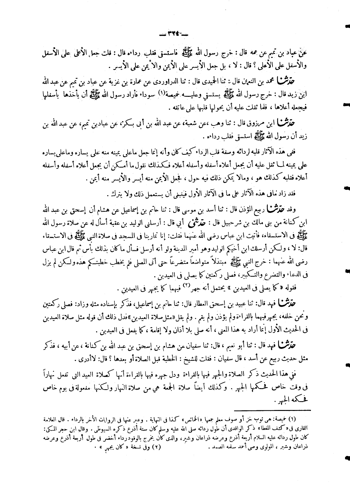 1901 - حَدَّثَنَا مُحَمَّدُ بْنُ النُّعْمَانِ، قَالَ: ثنا الْحُمَيْدِيُّ، قَالَ: ثنا الدَّرَاوَرْدِيُّ، عَنْ عُمَارَةَ بْنِ غَزِيَّةَ، عَنْ عَبَّادِ بْنِ تَمِيمٍ، عَنْ عَبْدِ اللهِ بْنِ زَيْدٍ، قَالَ: «خَرَجَ رَسُولُ اللهِ صَلَّى اللَّهُ عَلَيْهِ وَسَلَّمَ §يَسْتَسْقِي وَعَلَيْهِ خَمِيصَةٌ سَوْدَاءُ فَأَرَادَ رَسُولُ اللهِ صَلَّى اللَّهُ عَلَيْهِ وَسَلَّمَ أَنْ يَأْخُذَهَا بِأَسْفَلِهَا فَيَجْعَلَهُ أَعْلَاهَا , فَلَمَّا ثَقُلَتْ عَلَيْهِ أَنْ يُحَوِّلَهَا قَلَبَهَا عَلَى عَاتِقِهِ»