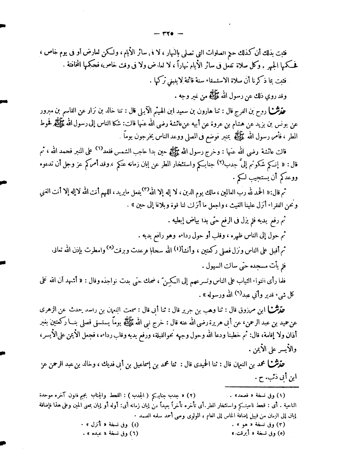 1906 - حَدَّثَنَا رَوْحُ بْنُ الْفَرَجِ قَالَ: ثنا هَارُونُ بْنُ سَعِيدِ بْنِ الْهَيْثَمِ الْأَيْلِيُّ قَالَ: ثنا خَالِدُ بْنُ نِزَارٍ عَنِ الْقَاسِمِ بْنِ مَبْرُورٍ عَنْ يُونُسَ بْنِ يَزِيدَ عَنْ هِشَامِ بْنِ عُرْوَةَ عَنْ أَبِيهِ عَنْ عَائِشَةَ رَضِيَ اللهُ عَنْهَا قَالَتْ: شَكَا النَّاسُ إِلَى رَسُولِ اللهِ صَلَّى اللَّهُ عَلَيْهِ وَسَلَّمَ قُحُوطَ الْمَطَرِ , فَأَمَرَ رَسُولُ اللهِ صَلَّى اللَّهُ عَلَيْهِ وَسَلَّمَ بِمِنْبَرٍ فَوُضِعَ فِي الْمُصَلَّى وَوَعَدَ النَّاسَ يَخْرُجُونَ يَوْمًا. قَالَتْ عَائِشَةُ رَضِيَ اللهُ عَنْهَا: وَخَرَجَ رَسُولُ اللهِ صَلَّى اللَّهُ عَلَيْهِ وَسَلَّمَ حِينَ بَدَا حَاجِبُ الشَّمْسِ فَقَعَدَ عَلَى الْمِنْبَرِ فَحَمِدَ اللهَ , ثُمَّ قَالَ: «إِنَّكُمْ شَكَوْتُمْ إِلَيَّ جَدْبَ جَنَابِكُمْ وَاسْتِئْخَارَ الْمَطَرِ عَنْ إِبَّانِ زَمَانِهِ عَنْكُمْ , وَقَدْ أَمَرَكُمْ عَزَّ وَجَلَّ أَنْ تَدْعُوهُ وَوَعَدَكُمْ أَنْ يَسْتَجِيبَ لَكُمْ» ثُمَّ قَالَ: «الْحَمْدُ لِلَّهِ رَبِّ الْعَالَمِينَ , مَالِكِ يَوْمِ الدِّينِ , لَا إِلَهَ إِلَّا اللهُ يَفْعَلُ مَا يُرِيدُ , اللهُمَّ أَنْتَ اللهُ لَا إِلَهَ إِلَّا أَنْتَ الْغَنِيُّ وَنَحْنُ الْفُقَرَاءُ §أَنْزِلْ عَلَيْنَا الْغَيْثَ , وَاجْعَلْ مَا أَنْزَلْتَ لَنَا قُوَّةً وَبَلَاغًا إِلَى حِينٍ» ثُمَّ رَفَعَ يَدَيْهِ فَلَمْ يَزَلْ فِي الرَّفْعِ حَتَّى بَدَا بَيَاضُ إِبْطَيْهِ. ثُمَّ حَوَّلَ إِلَى النَّاسِ ظَهْرَهُ , وَقَلَبَ أَوْ حَوَّلَ رِدَاءَهُ وَهُوَ رَافِعٌ يَدَيْهِ. ثُمَّ أَقْبَلَ عَلَى النَّاسِ وَنَزَلَ فَصَلَّى رَكْعَتَيْنِ , وَأَنْشَأَ اللهُ سَحَابًا فَرَعَدَتْ وَبَرَقَتْ وَأَمْطَرَتْ بِإِذْنِ اللهِ تَعَالَى فَلَمْ يَأْتِ مَسْجِدَهُ حَتَّى سَالَتِ السُّيُولُ. فَلَمَّا رَأَى الْتِوَاءَ الثِّيَابِ عَلَى النَّاسِ وَتَسَرُّعَهُمْ إِلَى الْكِنِّ , ضَحِكَ حَتَّى بَدَتْ نَوَاجِذُهُ وَقَالَ: «أَشْهَدُ أَنَّ اللهَ عَلَى كُلِّ شَيْءٍ قَدِيرٌ وَأَنِّي عَبْدُ اللهِ وَرَسُولُهُ»